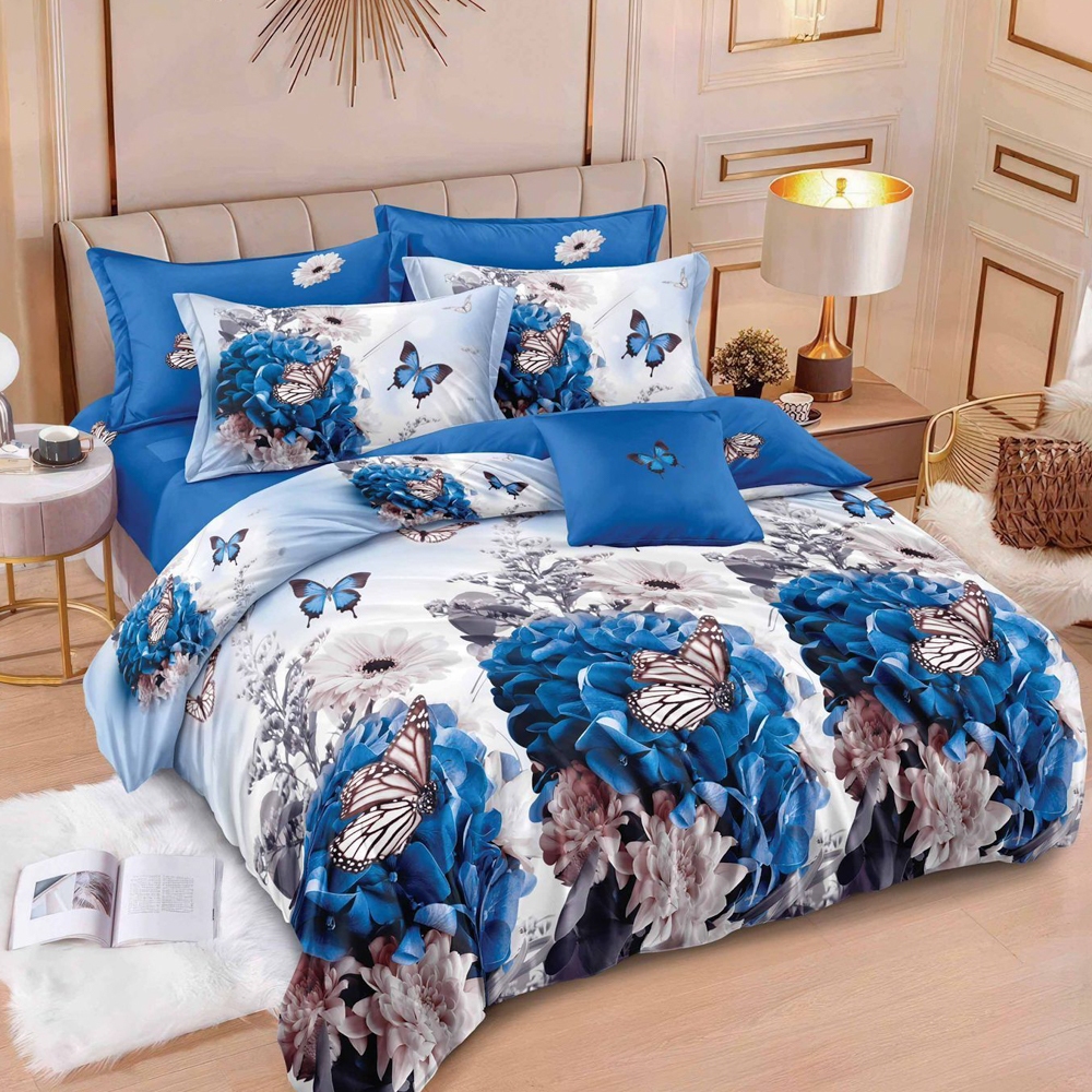 Lenjerie pat dublu, Finet, 6 piese, Alb, Albastru, fluturi
