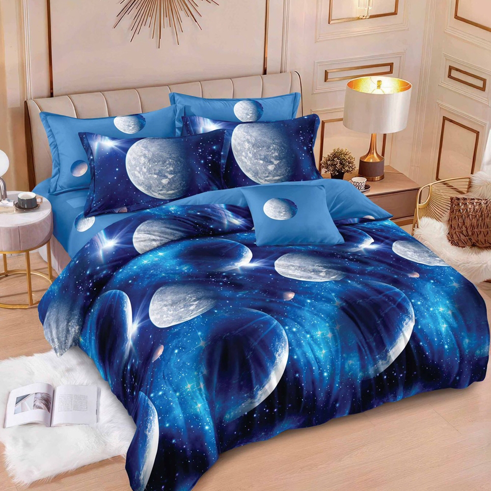 Lenjerie pat dublu, Finet, 6 piese, Albastru, planete, spatiu cosmic