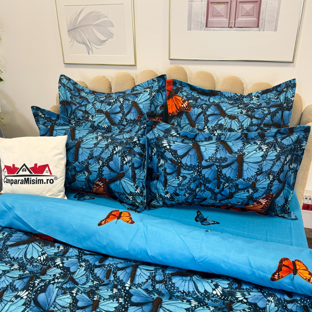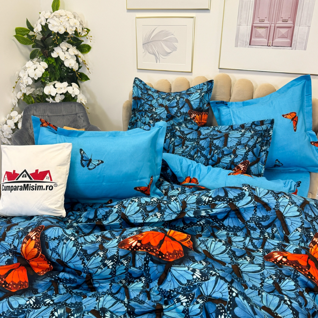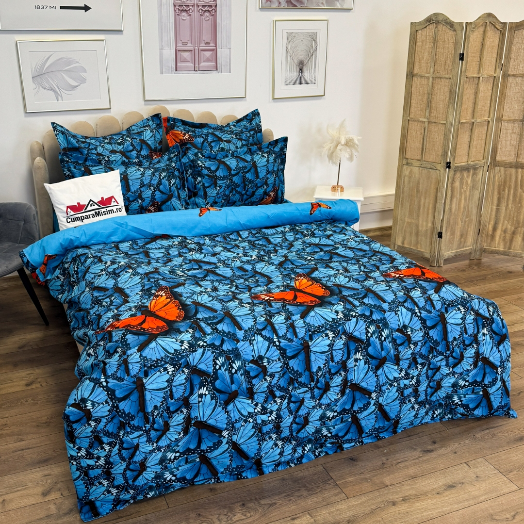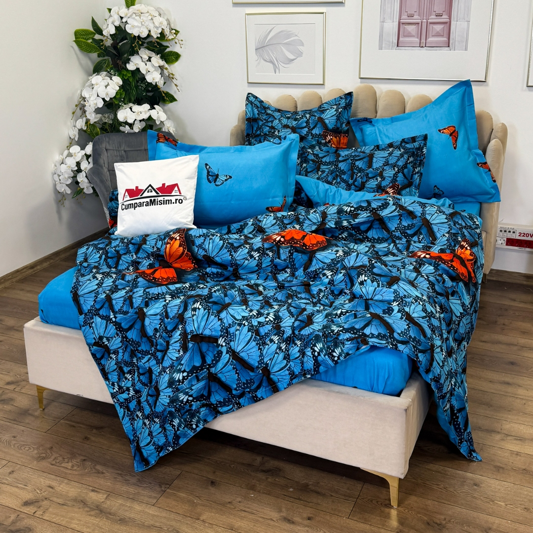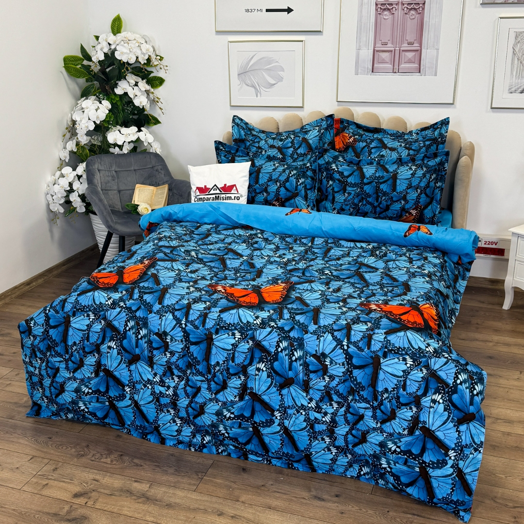 Lenjerie pat dublu cu ELASTIC, Finet, 6 piese, Albastru, fluturi portocalii