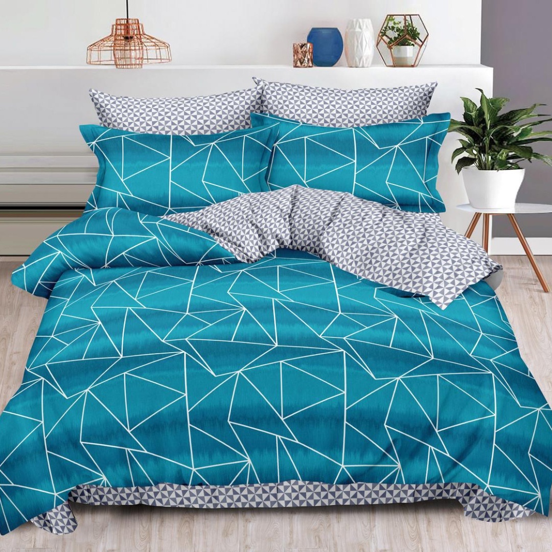 Lenjerie pat dublu cu ELASTIC, Finet, 6 piese, albastru, gri, dungi