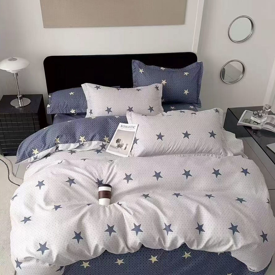 Lenjerie pat dublu cu ELASTIC, Finet, 6 piese, bej, albastru, inimioare