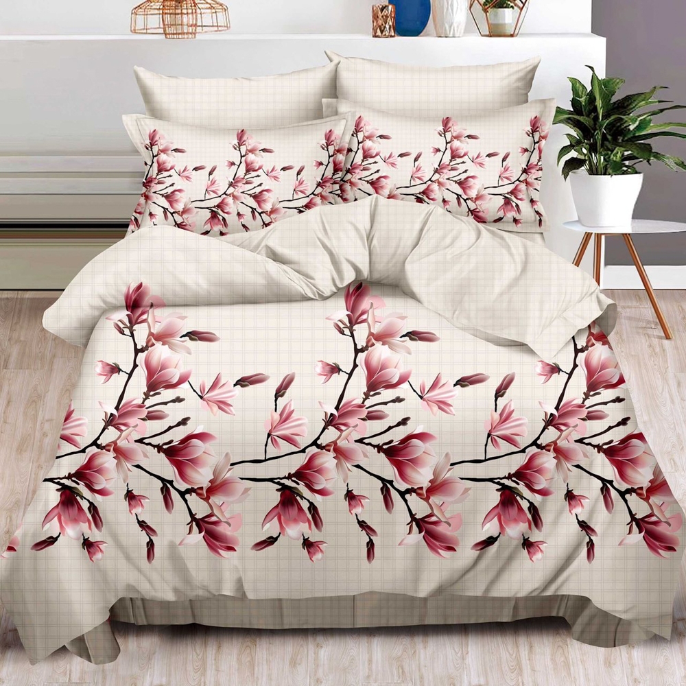 Lenjerie pat dublu cu ELASTIC, Finet, 6 piese, Bej, magnolii