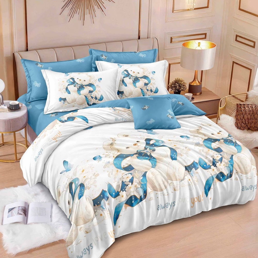 Lenjerie pat dublu cu ELASTIC, Finet, 6 piese, Bleu, ursuleti