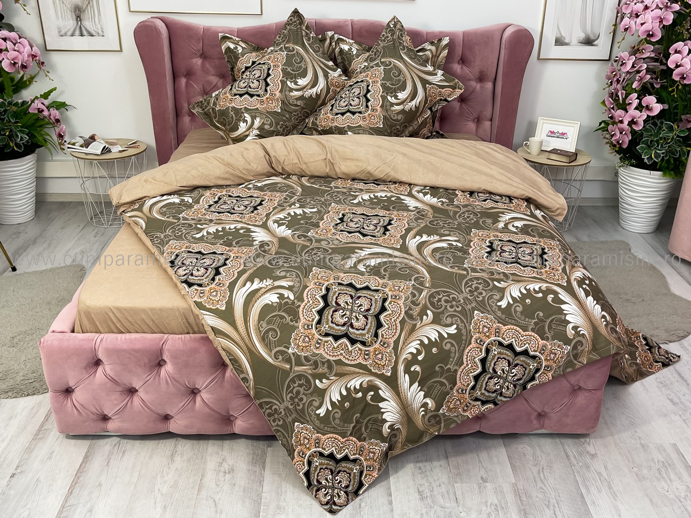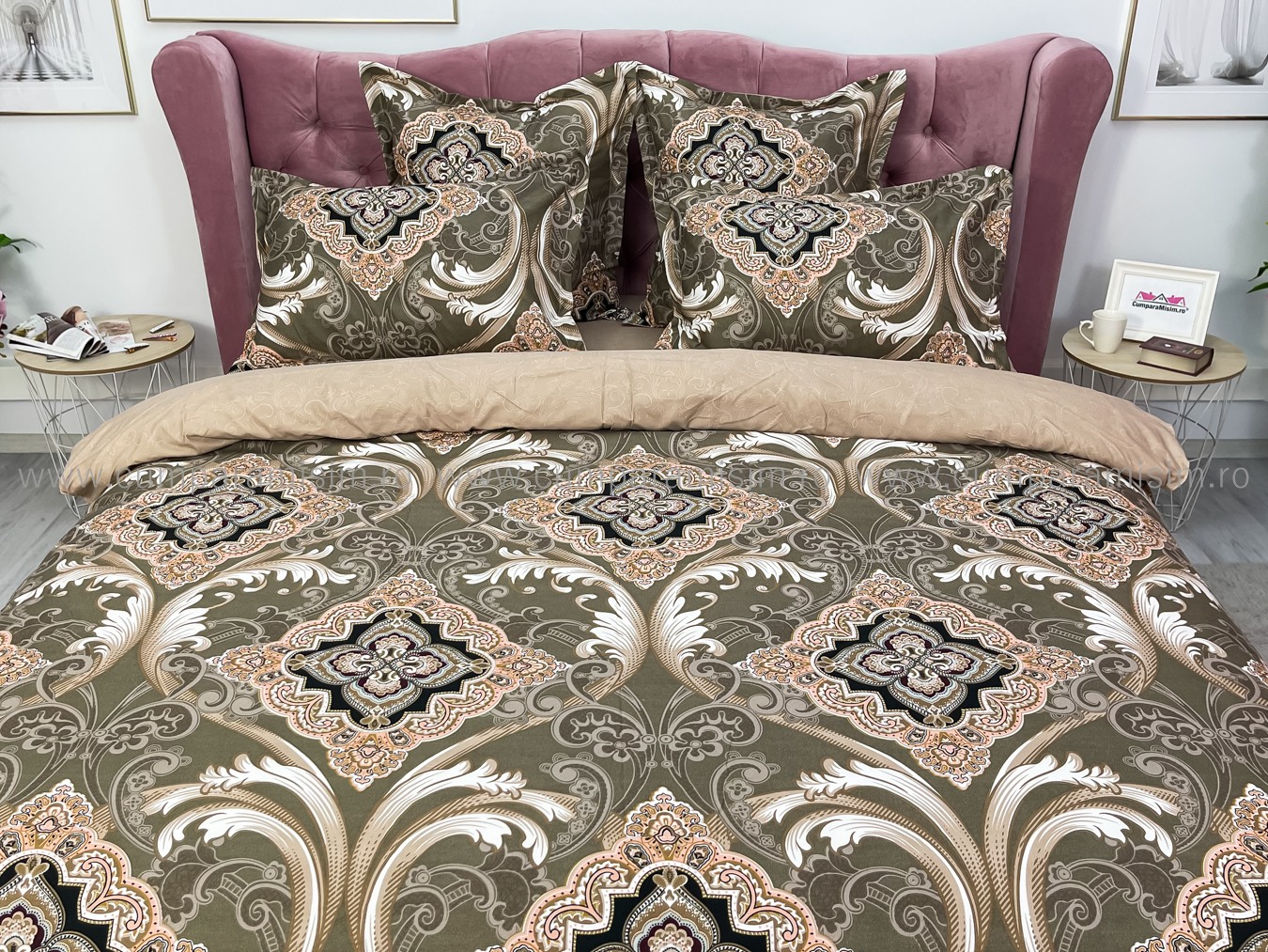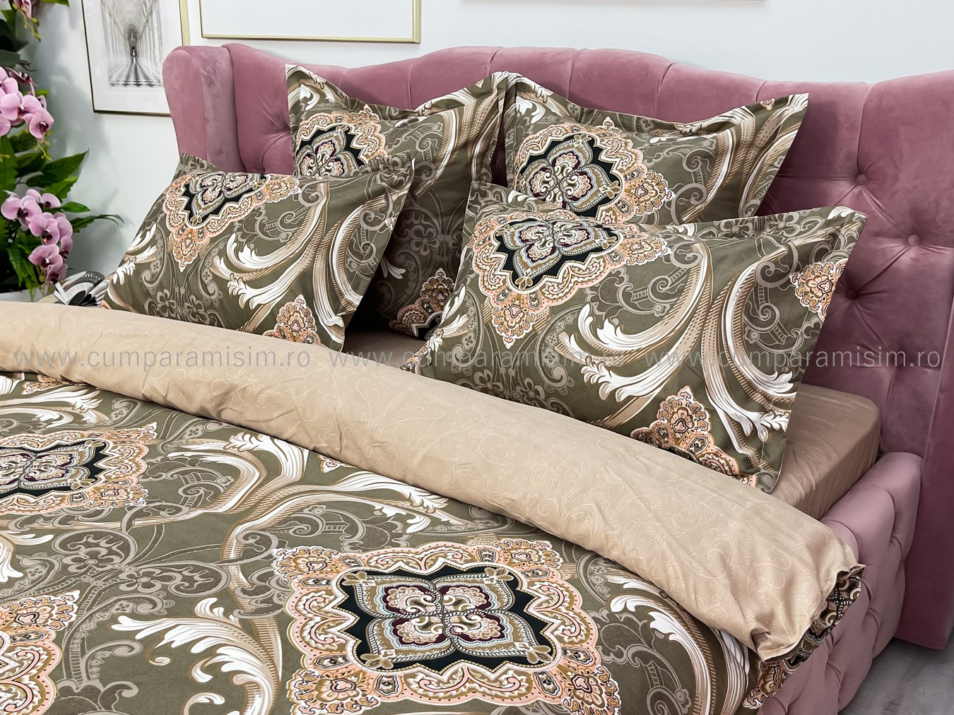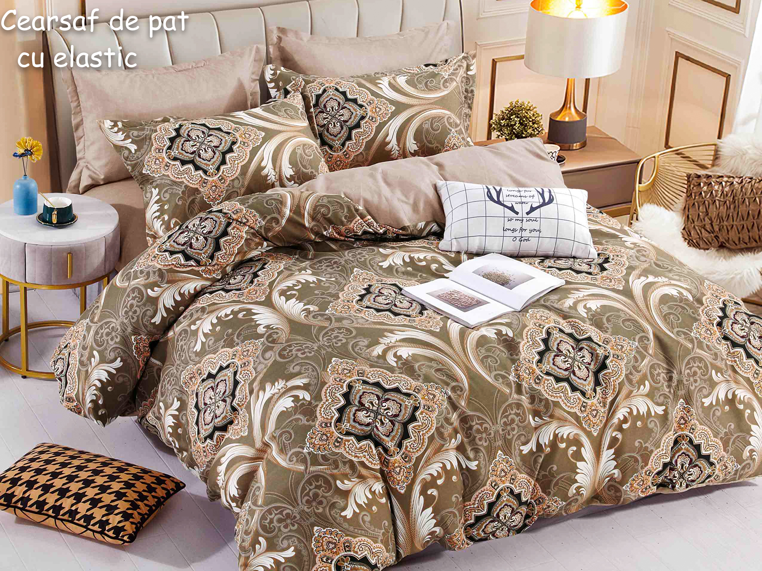 Lenjerie pat dublu, FINET, 6 piese, cu ELASTIC, Jojo Home, Bej-Maro, model elegant