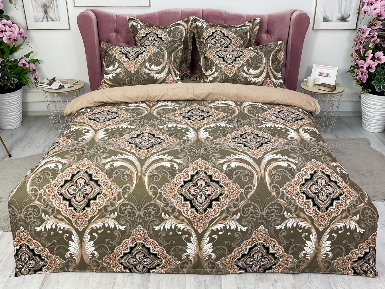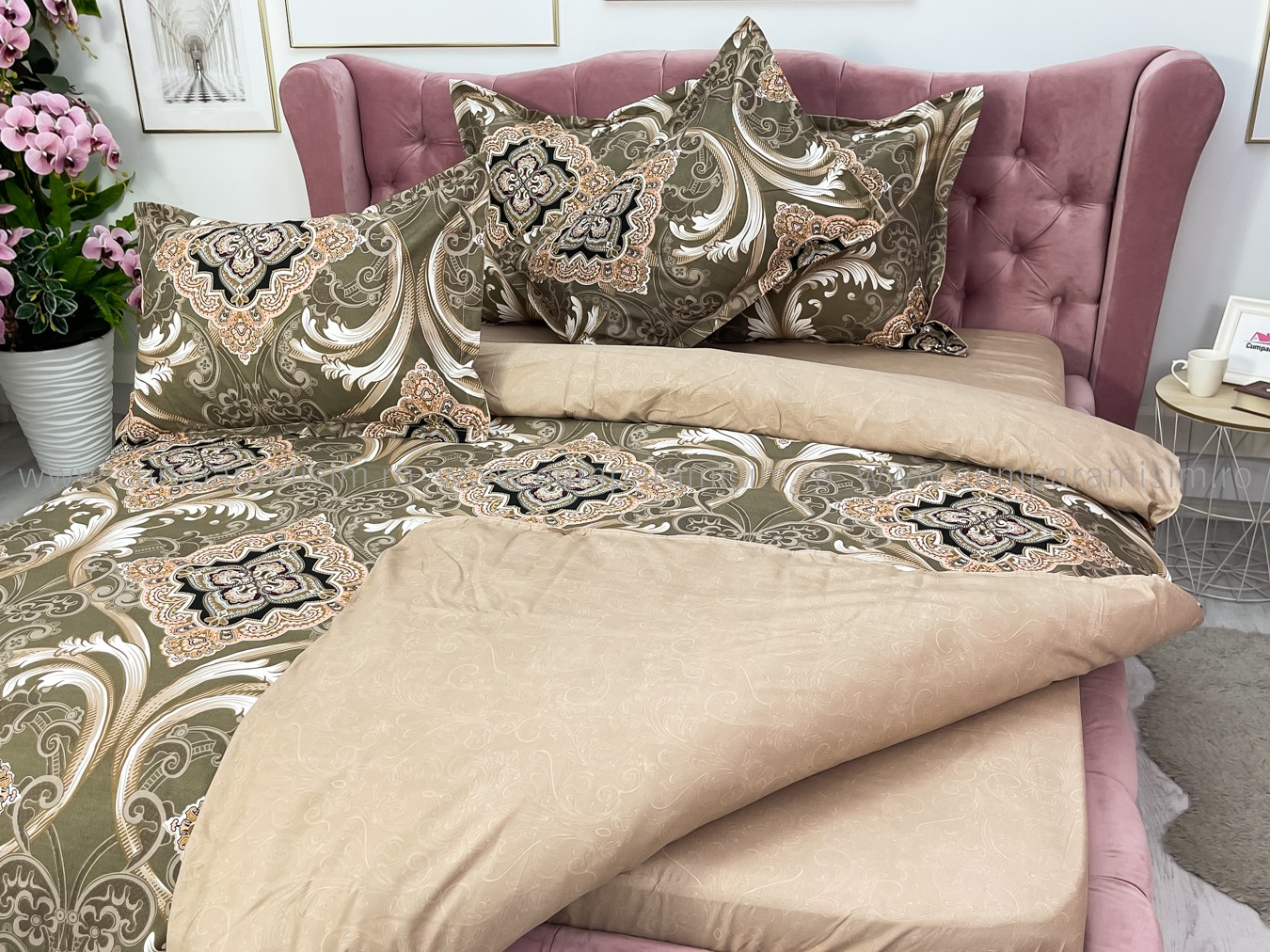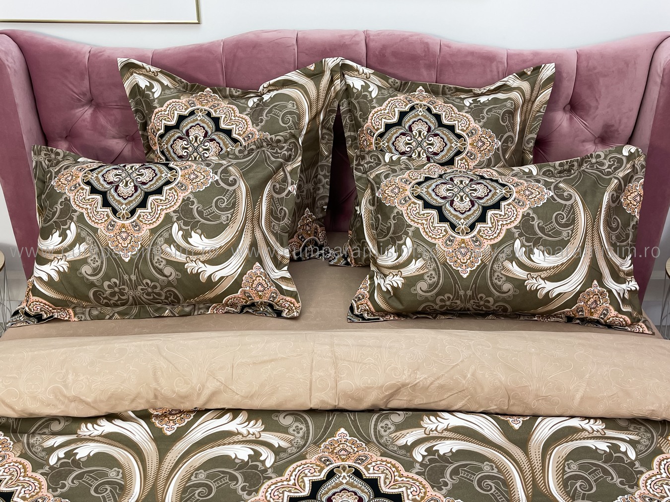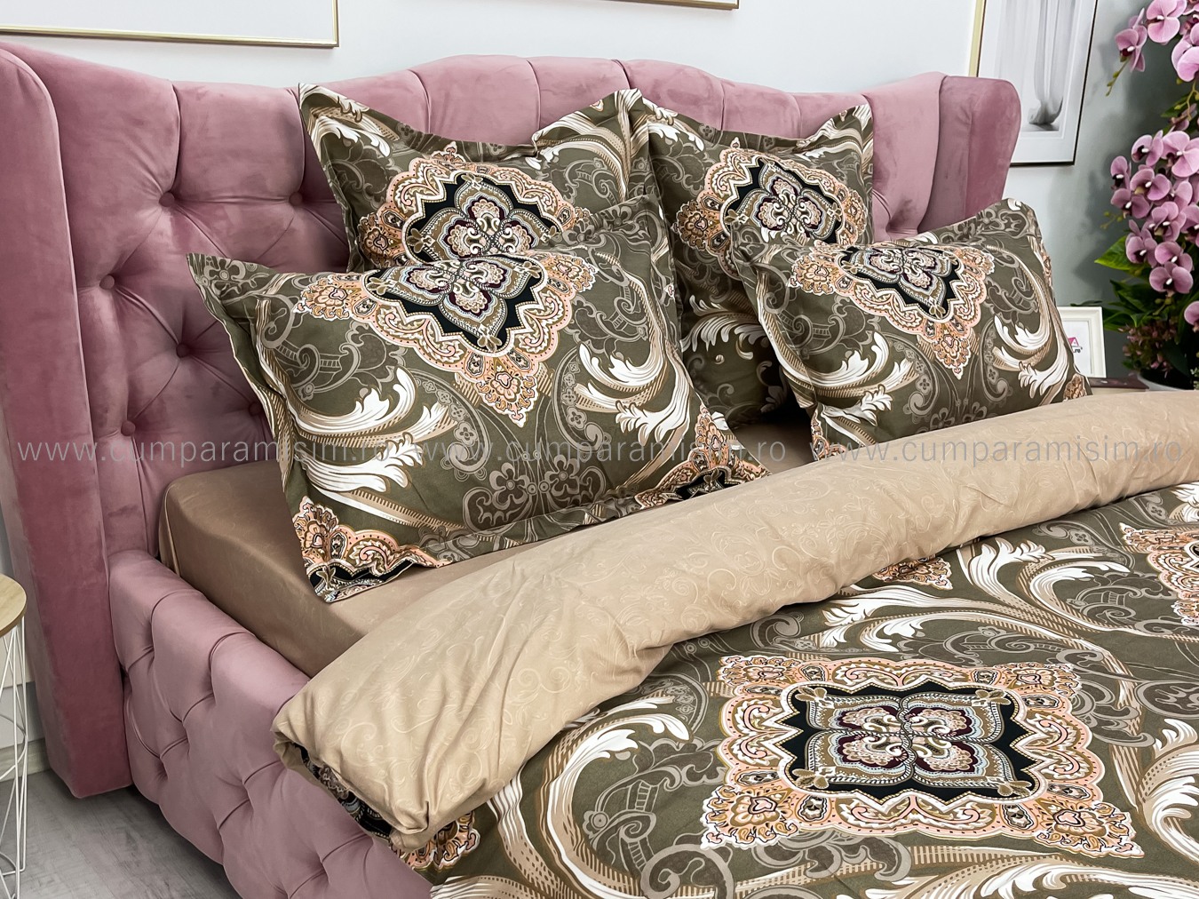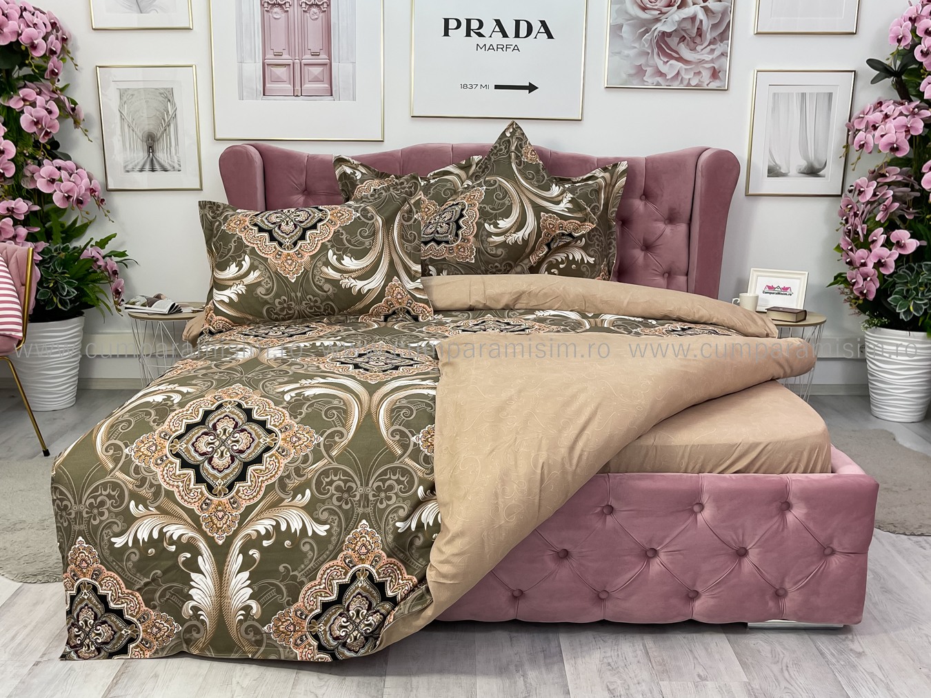 Lenjerie pat dublu, FINET, 6 piese, cu ELASTIC, Jojo Home, Bej-Maro, model elegant