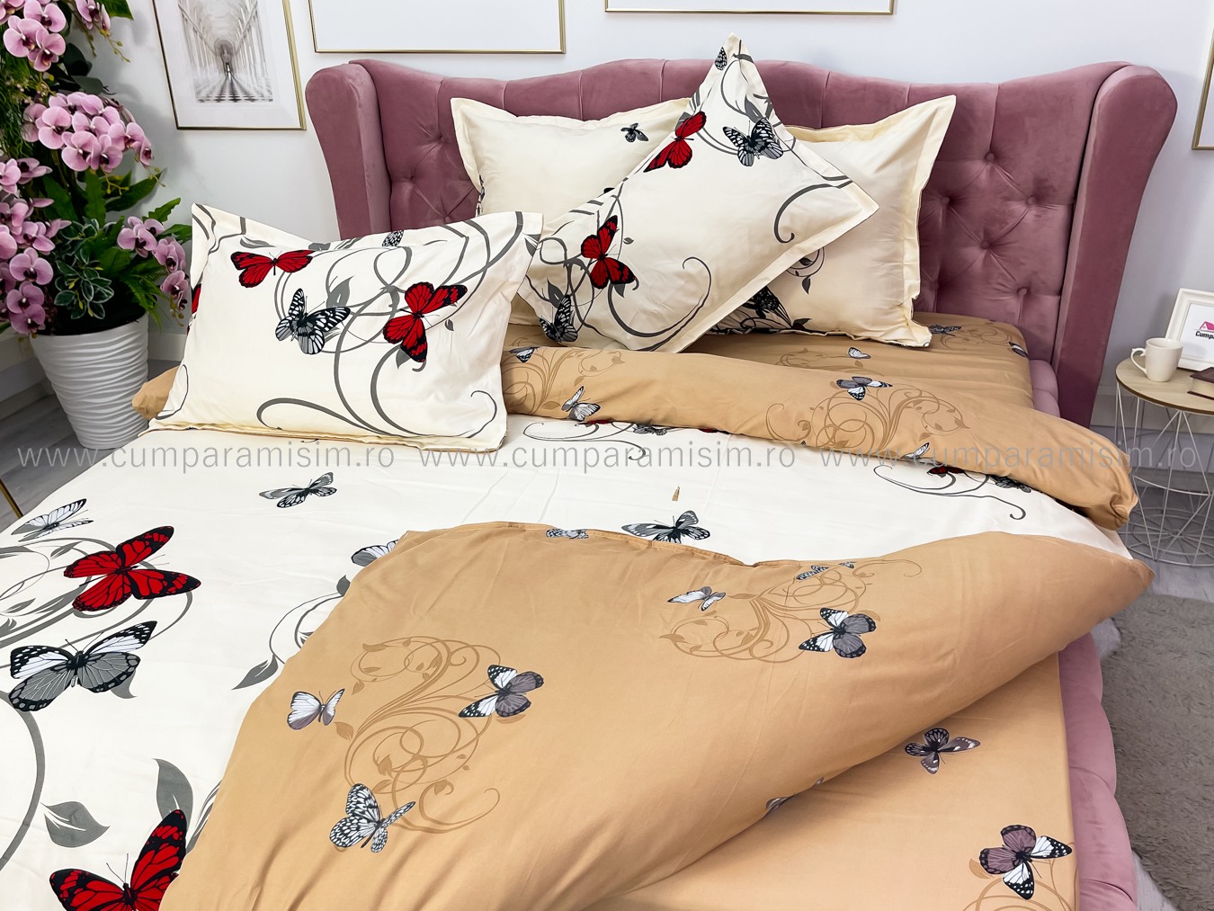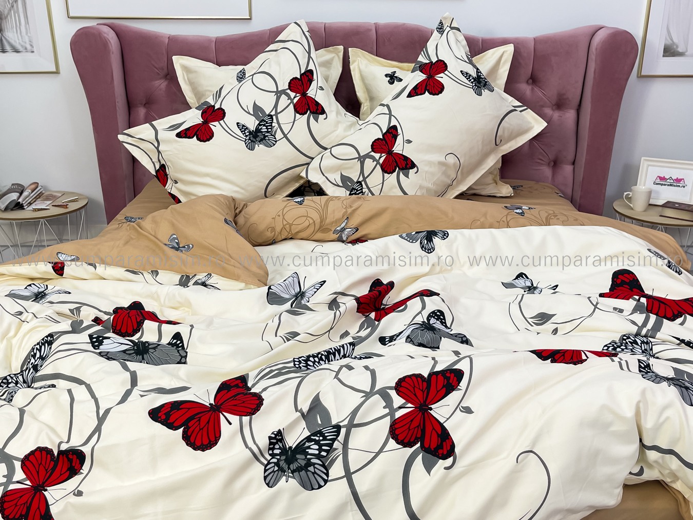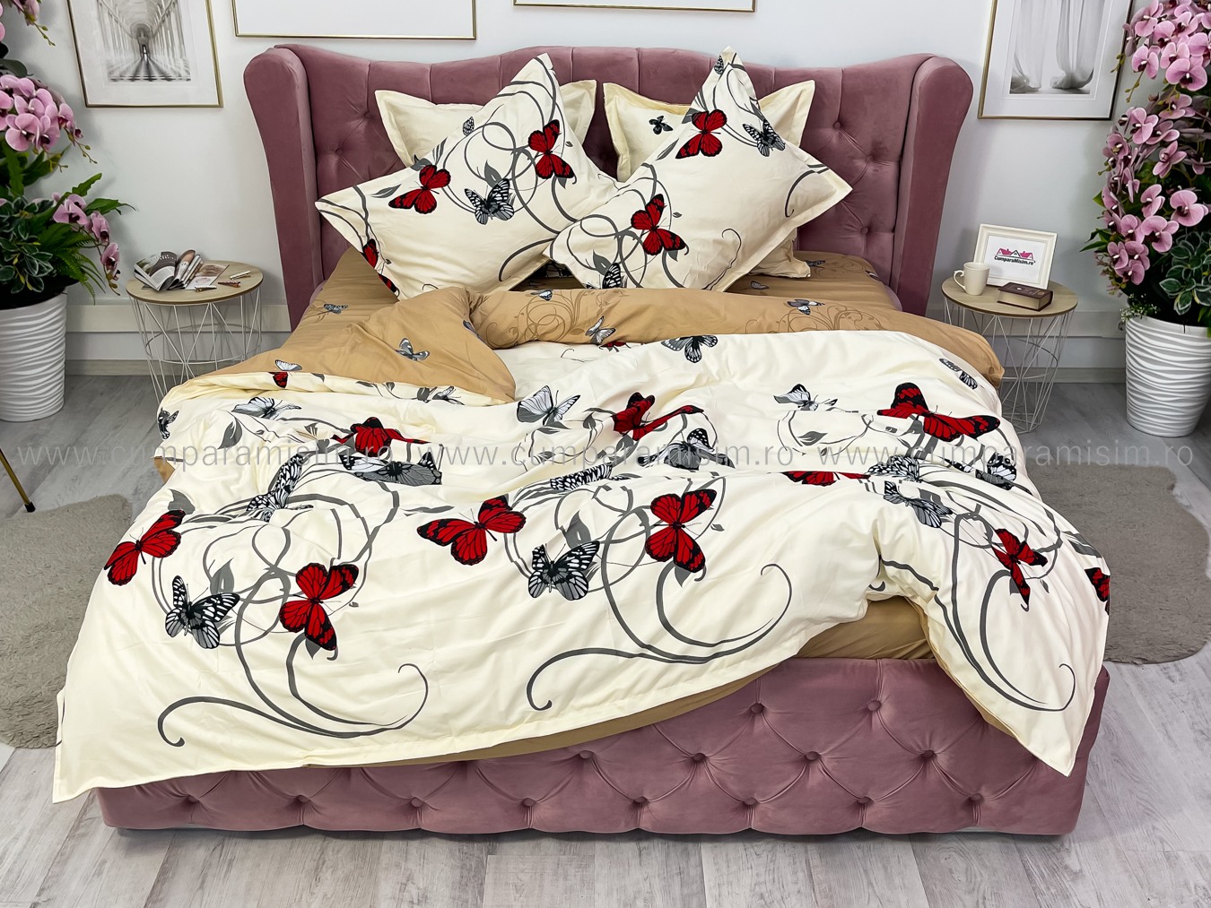 Lenjerie pat dublu, FINET, 6 piese, cu ELASTIC, Jojo Home, Crem-Multicolor, fluturi