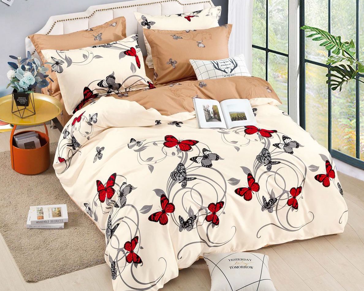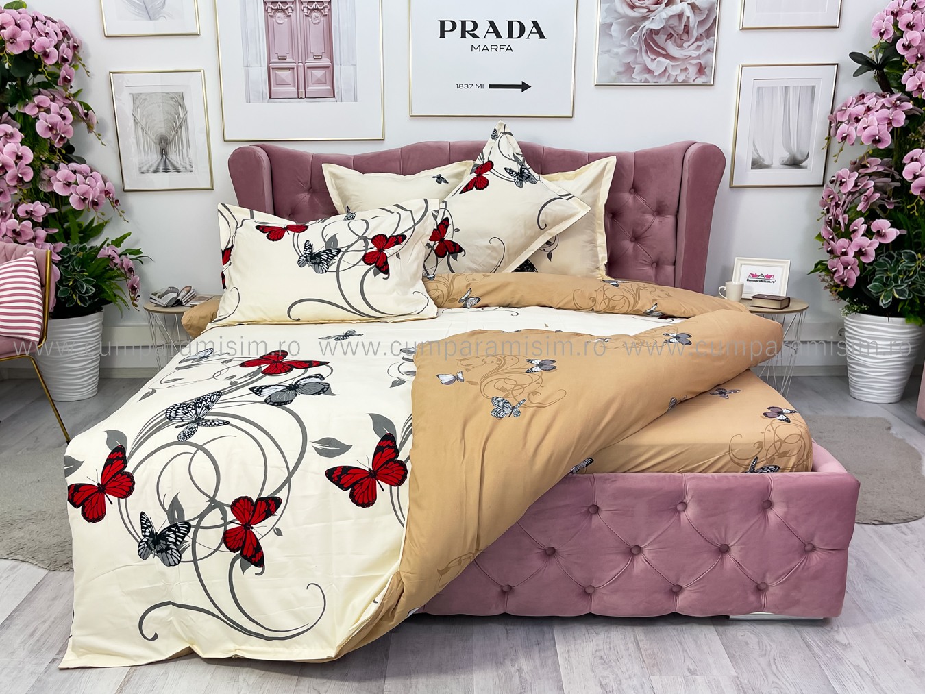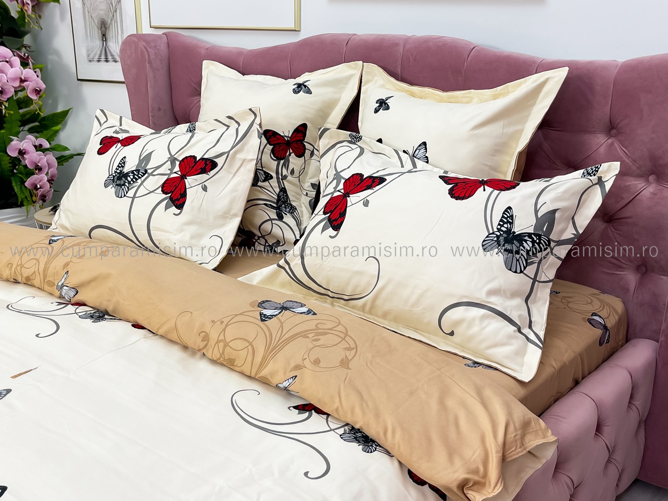 Lenjerie pat dublu, FINET, 6 piese, cu ELASTIC, Jojo Home, Crem-Multicolor, fluturi