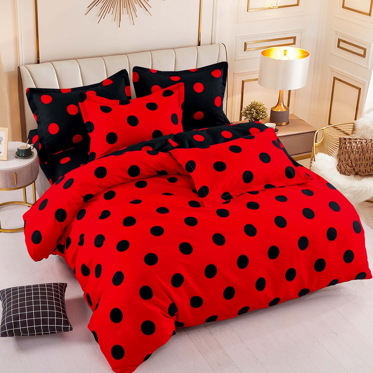 Lenjerie pat dublu, FINET, 6 piese, cu ELASTIC, Jojo Home, Rosu-Negru, buline