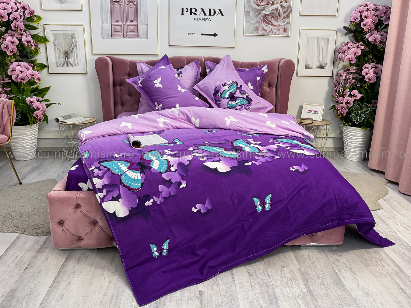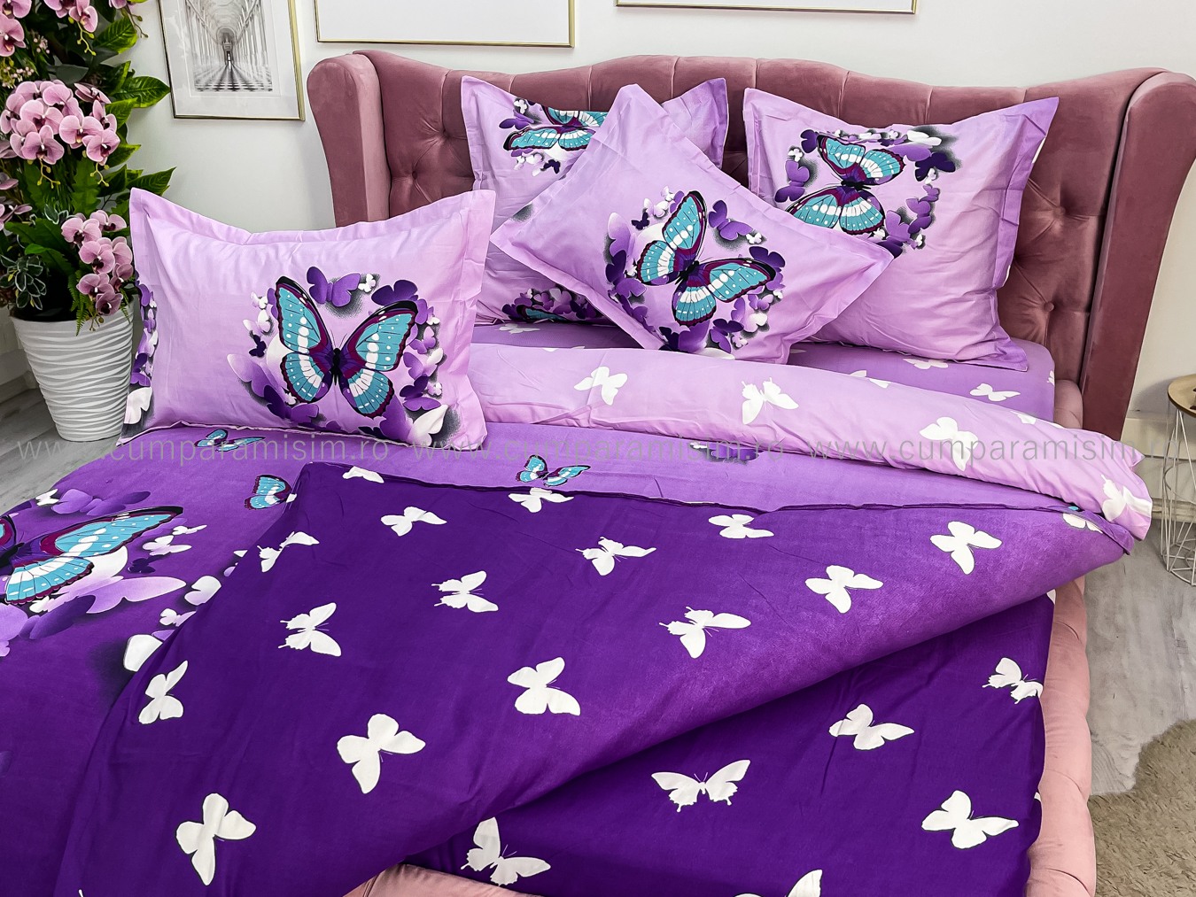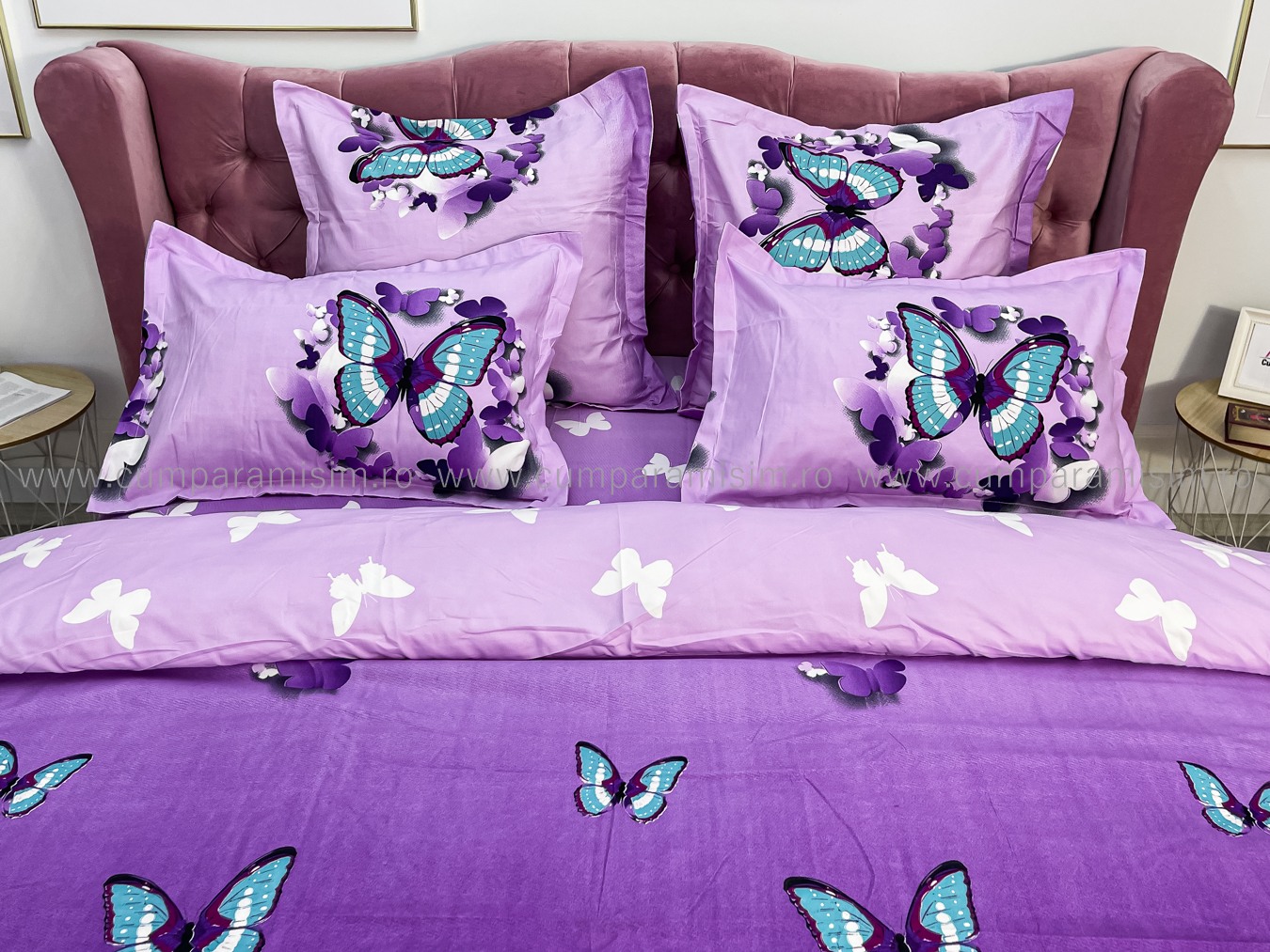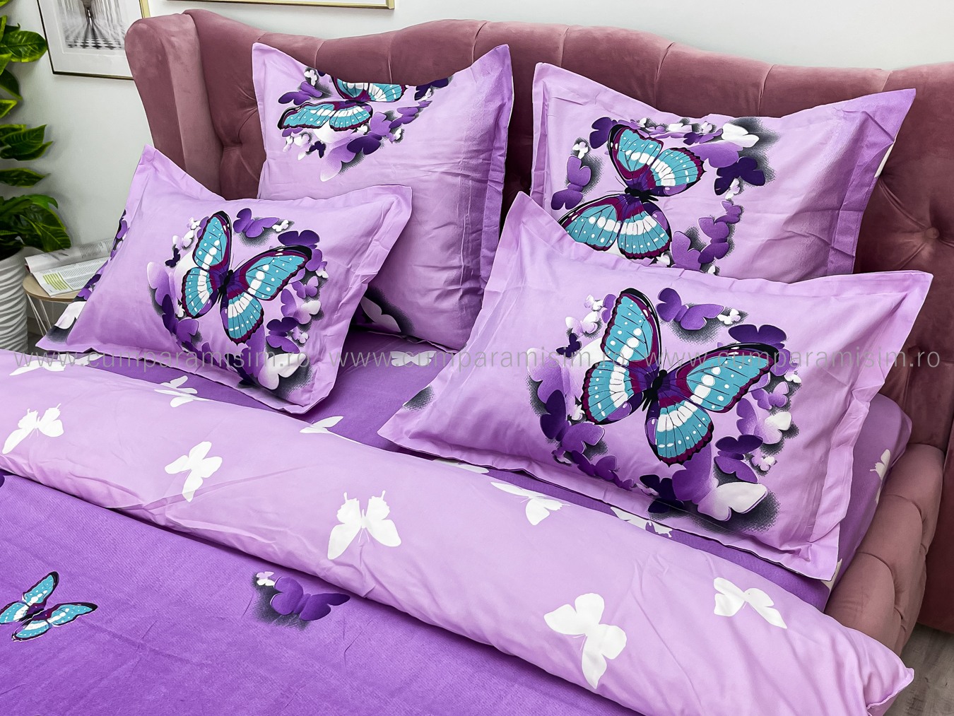 Lenjerie pat dublu, Finet, 6 piese, Mov, fluturi