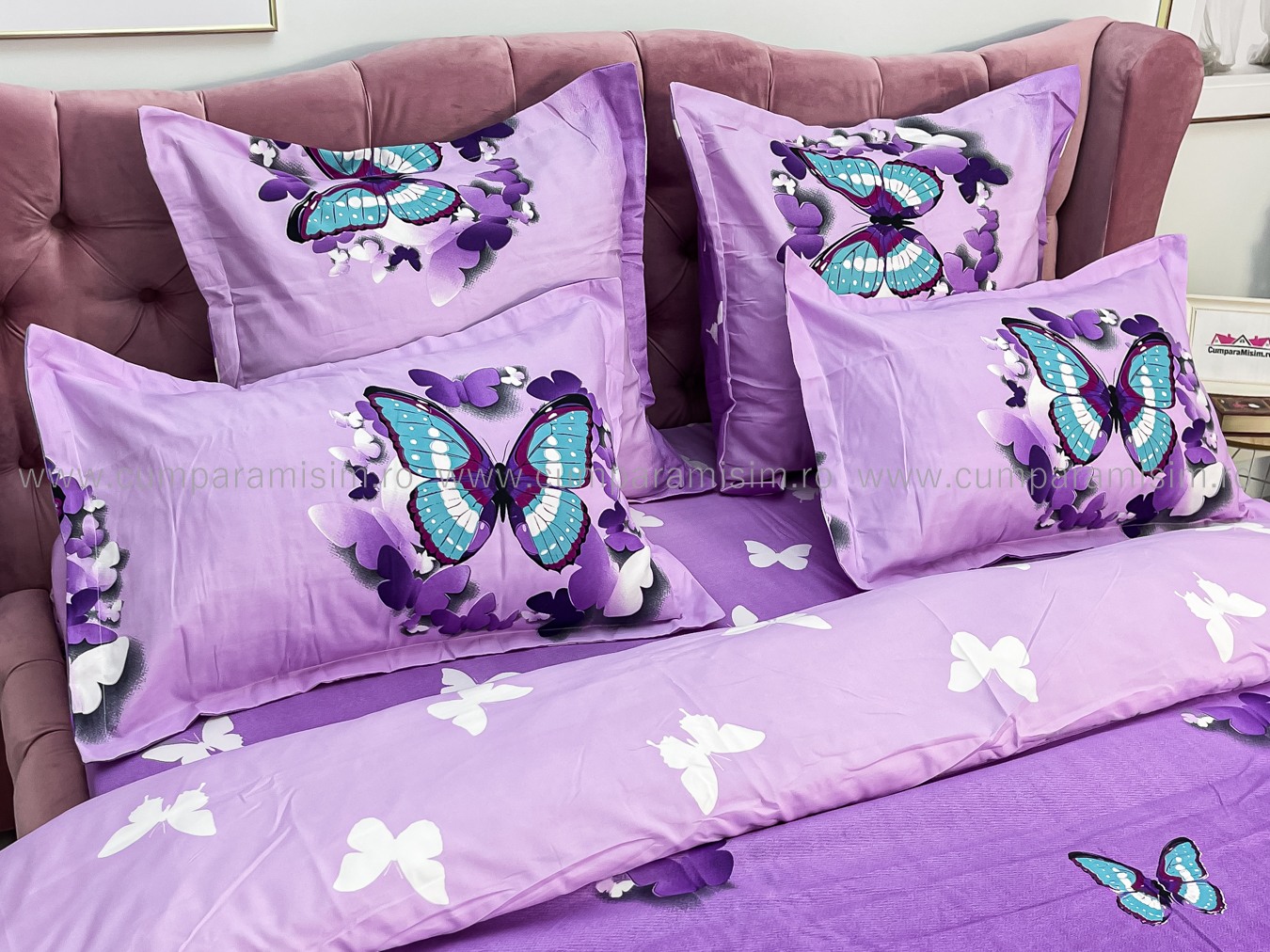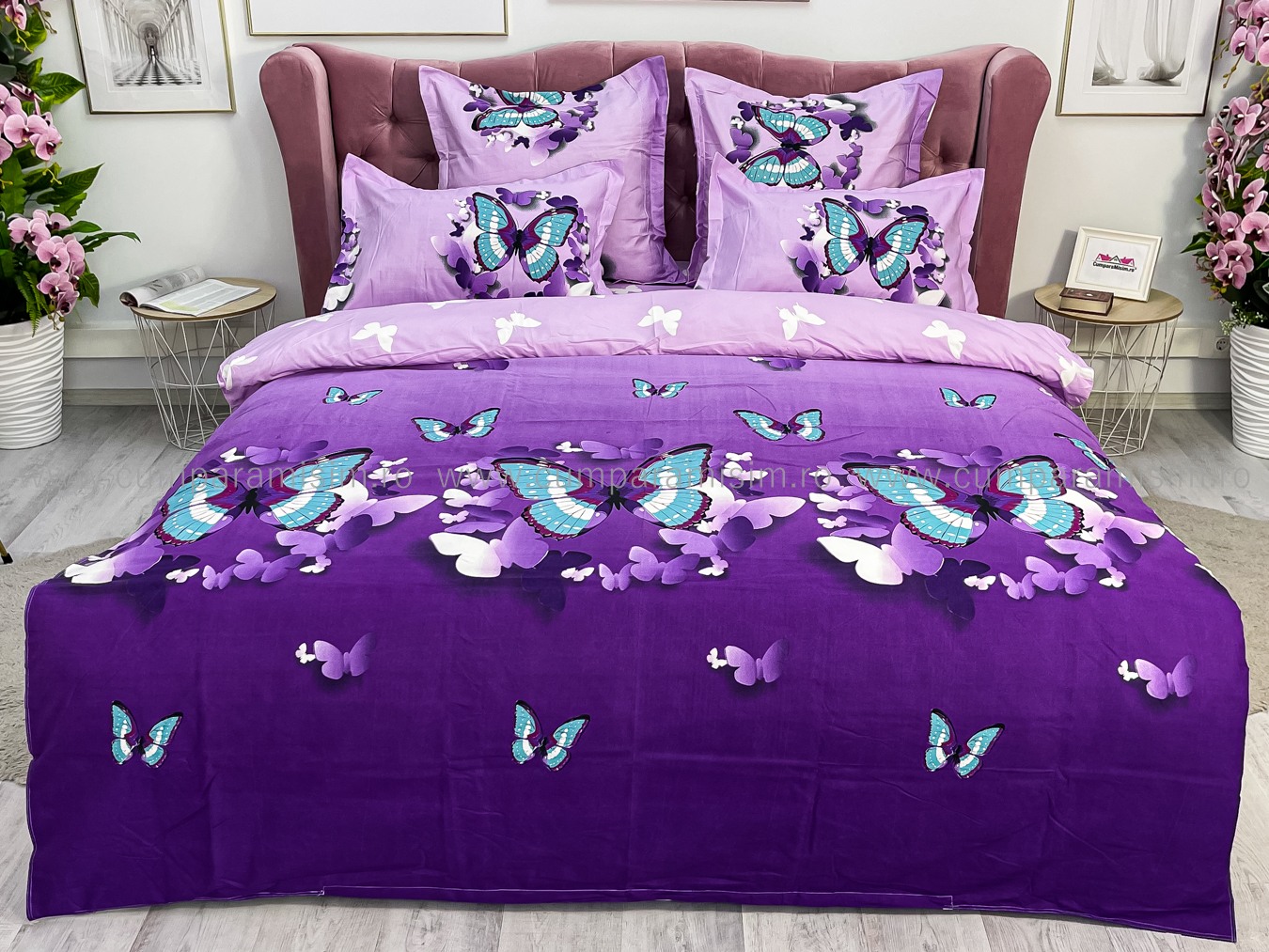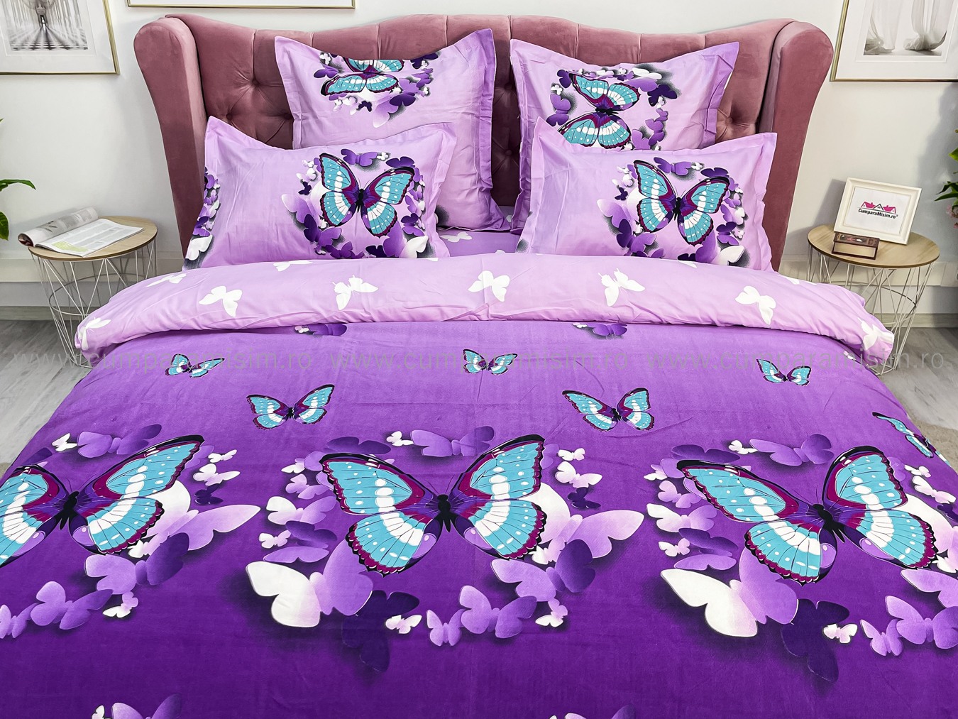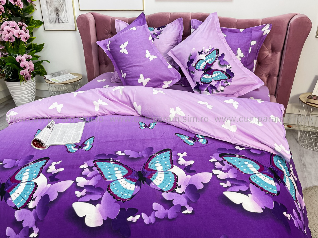 Lenjerie pat dublu, Finet, 6 piese, Mov, fluturi