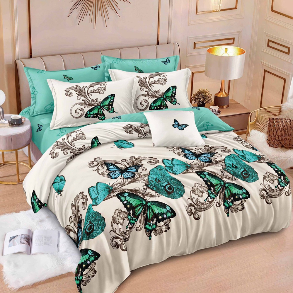 Lenjerie pat dublu, Finet, 6 piese, Turcuaz, fluturi