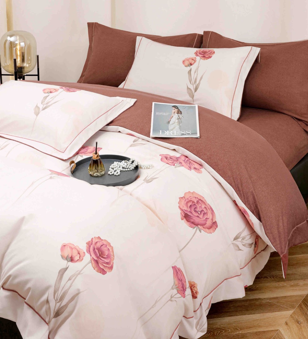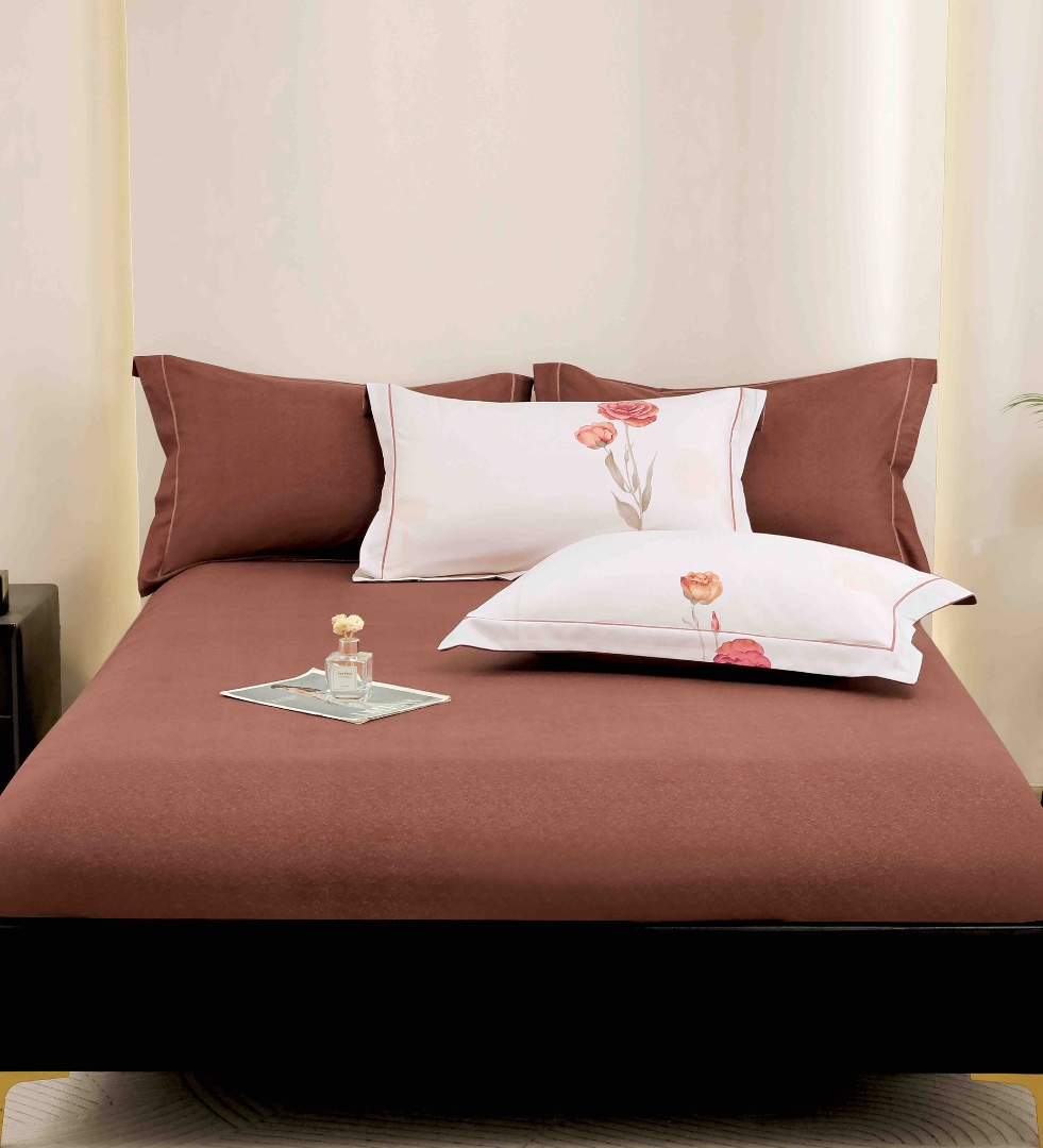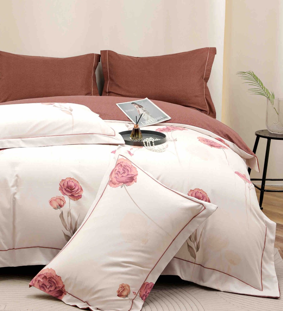 Lenjerie pat dublu, FINET DeLuxe, 6 piese, cu ELASTIC, Jojo Home, Cutie Eleganta, Roz, Maroniu, Flori