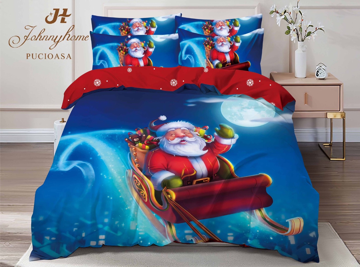 Lenjerie pat dublu, FINET, Digital Print, Craciun, Albastru, Rosu, Mos Craciun in sania lui