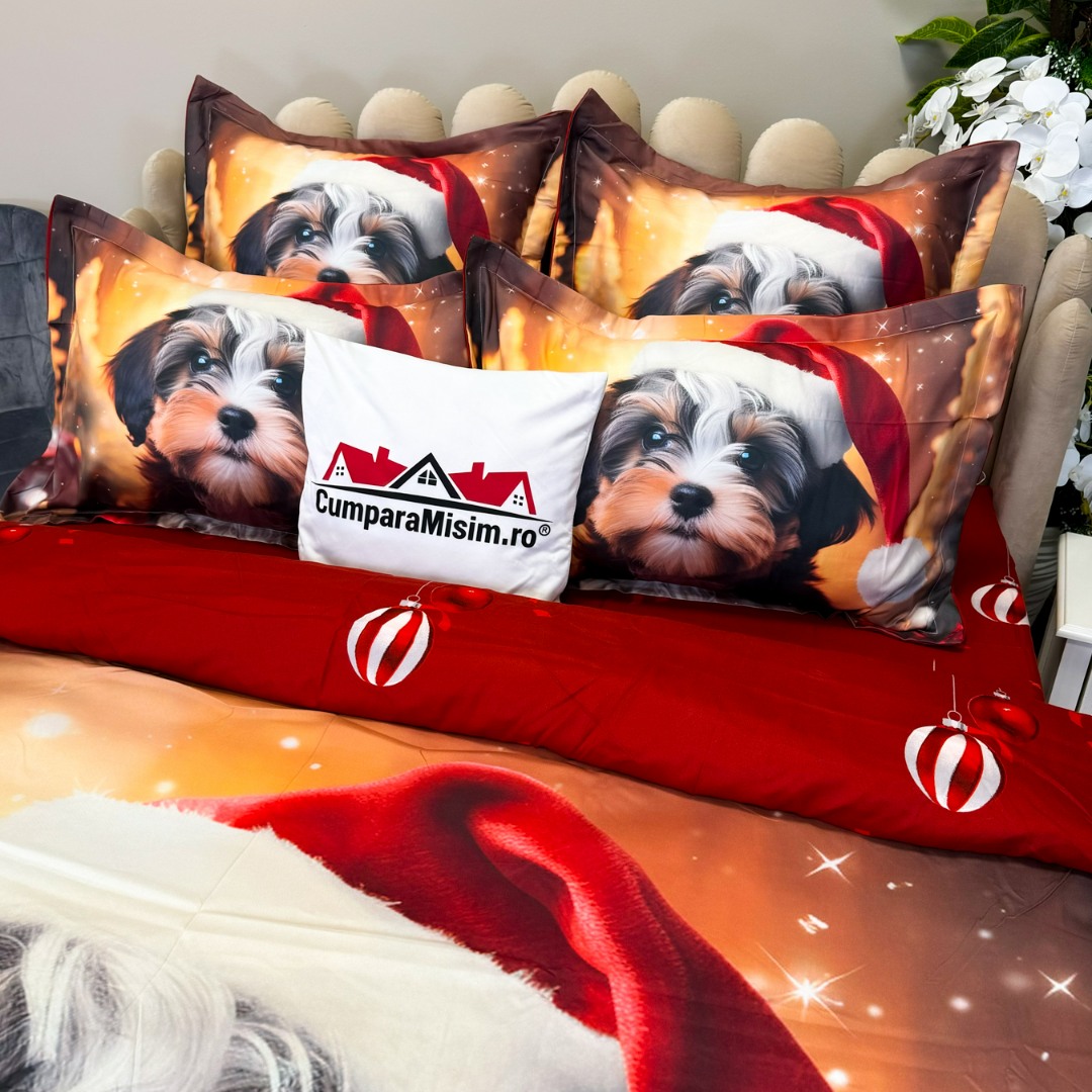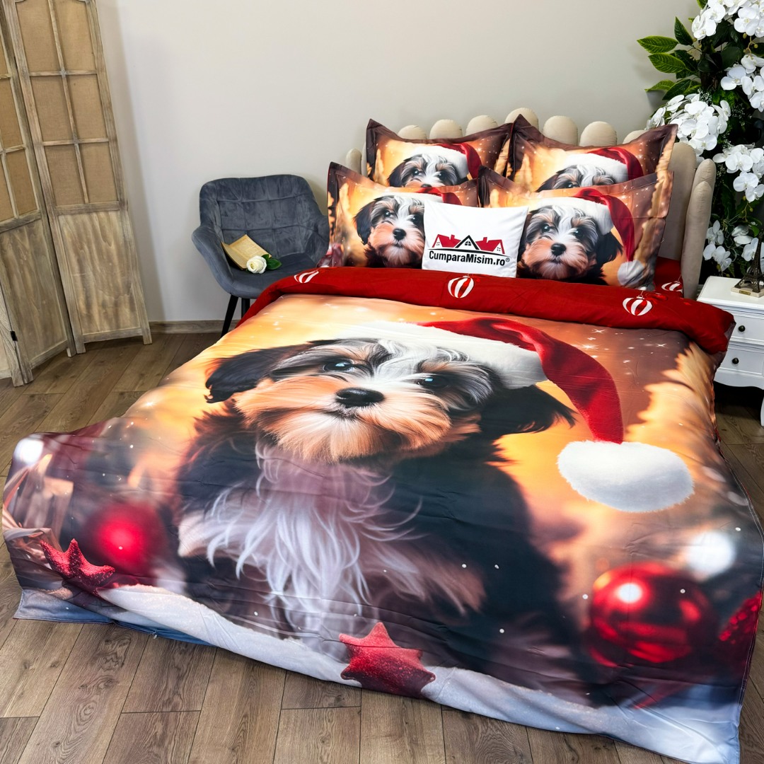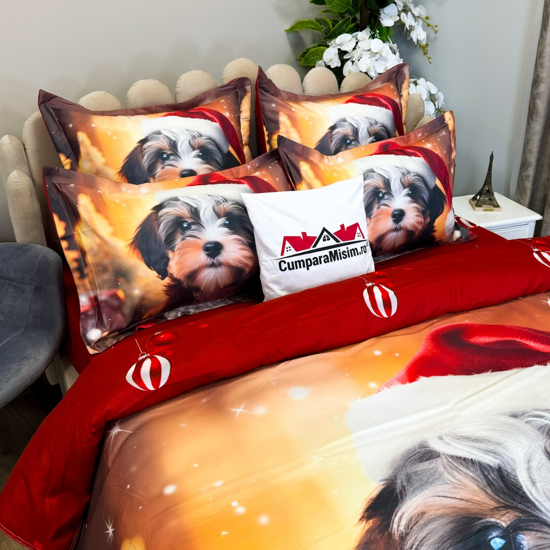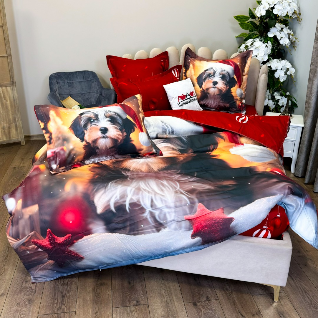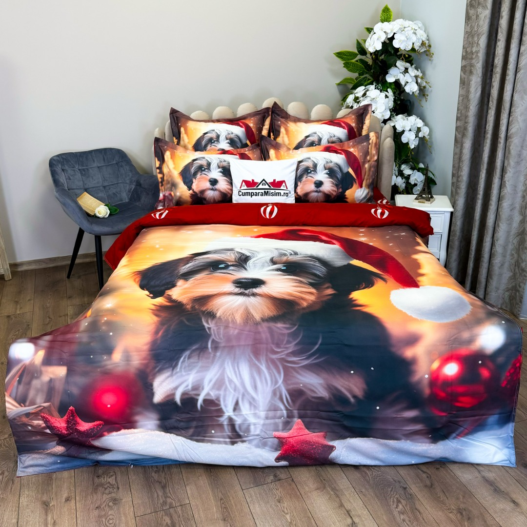 Lenjerie pat dublu, FINET, Digital Print, Craciun, Bej, Rosu, catel, bichon