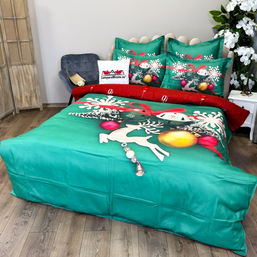Lenjerie pat dublu, FINET, Digital Print, Craciun, Verde, Rosu, decoratiuni de Craciun