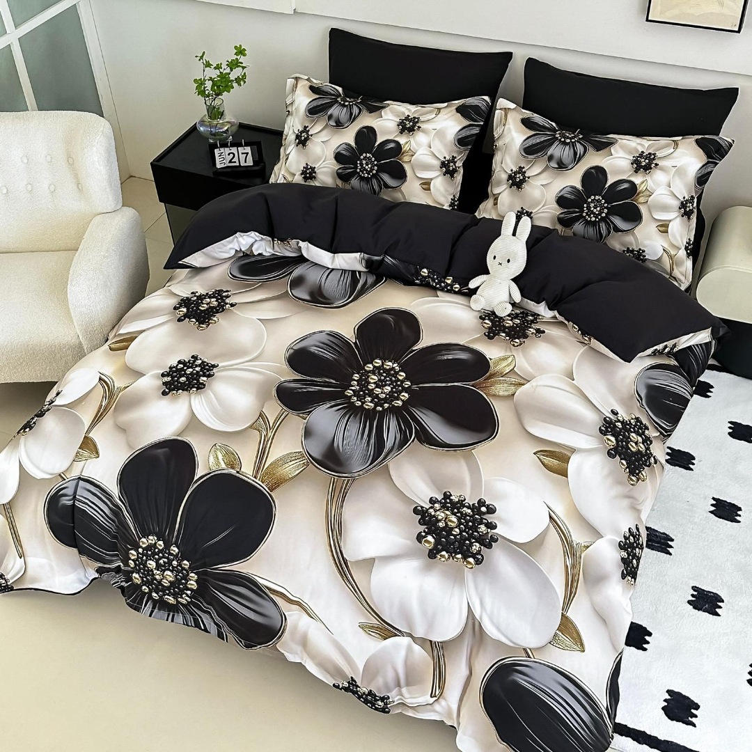 Lenjerie pat dublu, FINET, Imprimeu Digital 5D - Identic cu poza, Cu ELASTIC, 6 piese, Jojo Home, Alb, Negru, Flori