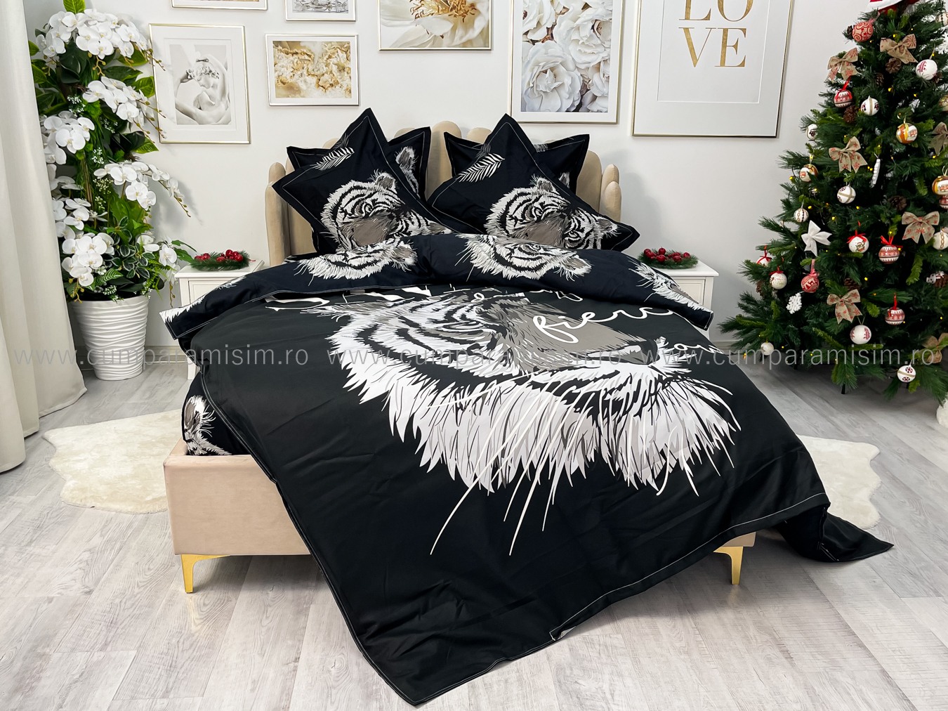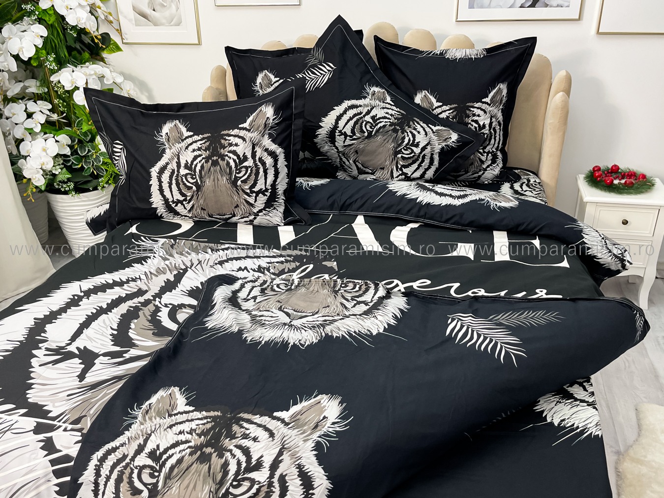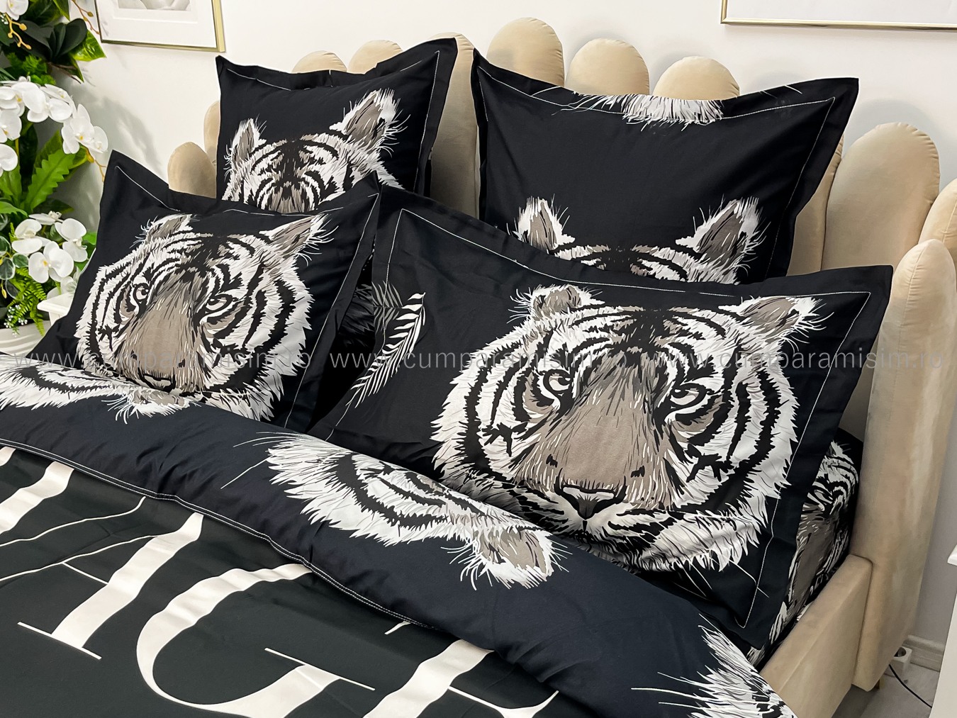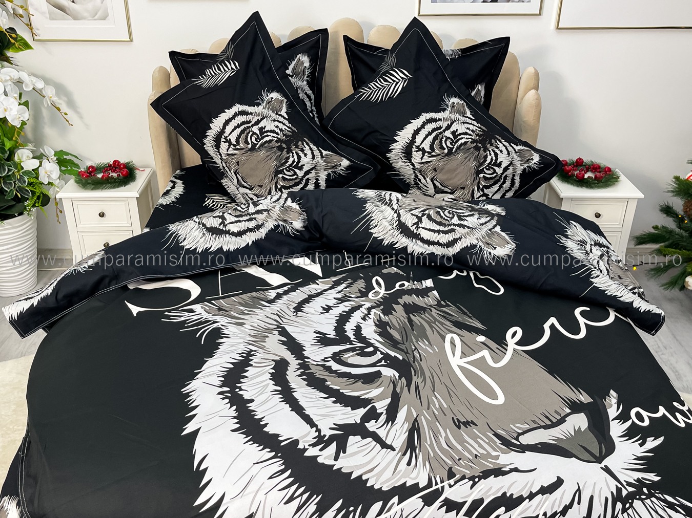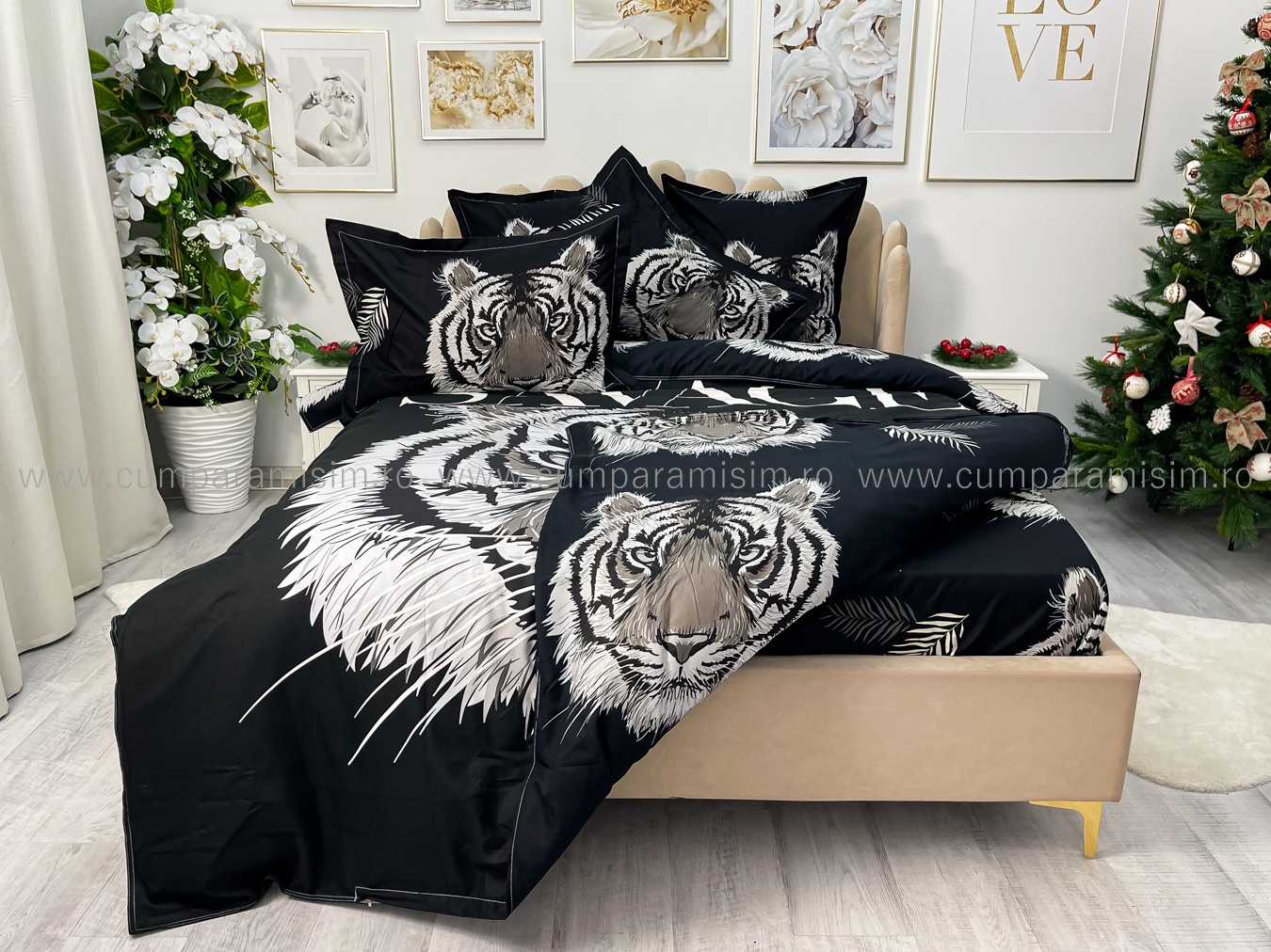 Lenjerie pat dublu, FINET, Imprimeu Digital - Identic cu poza, 6 piese, Jojo Home, Negru-Gri, tigru