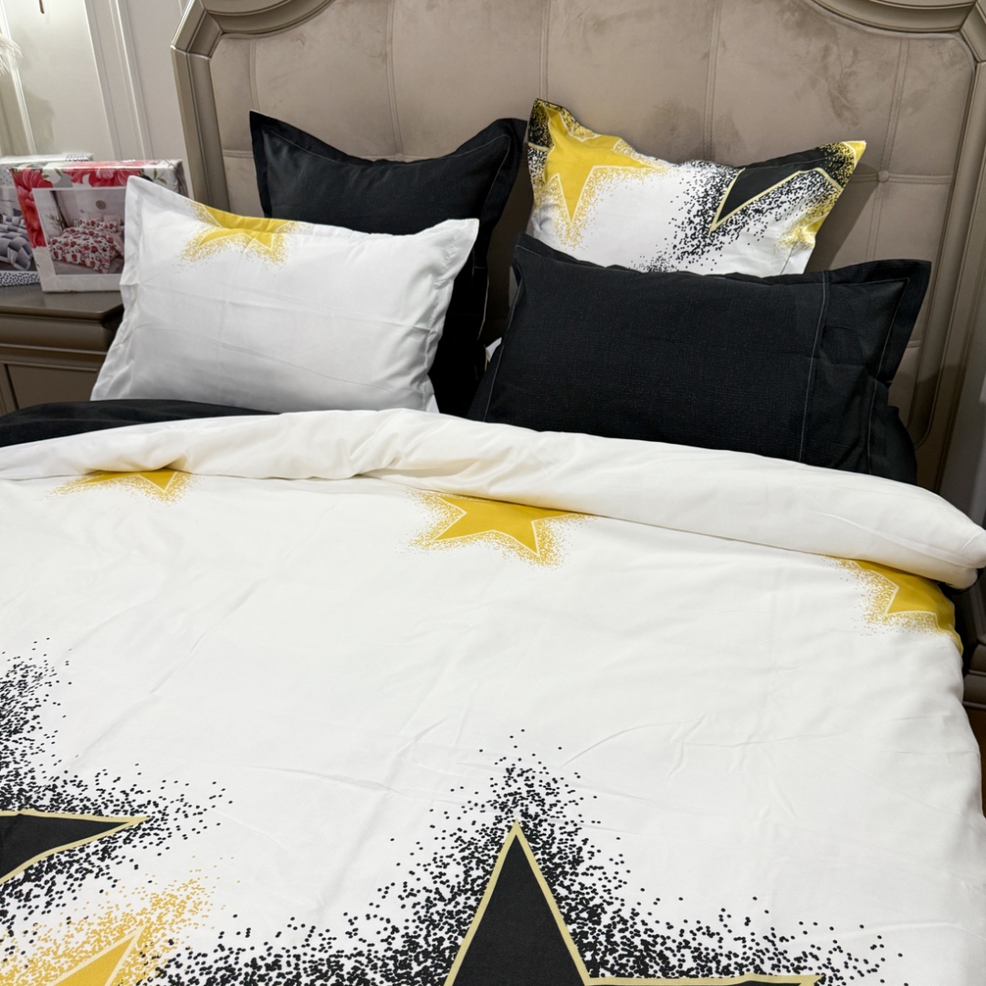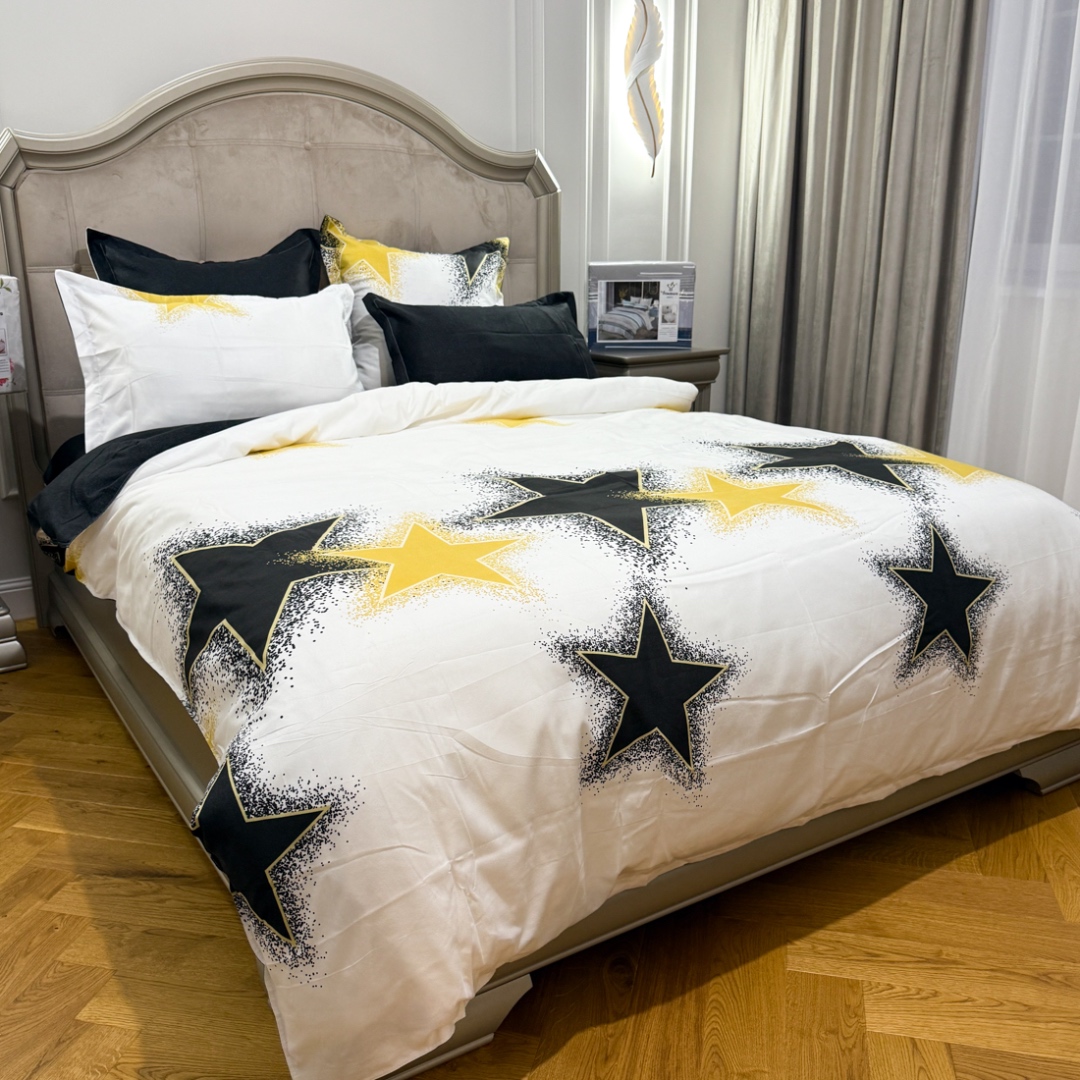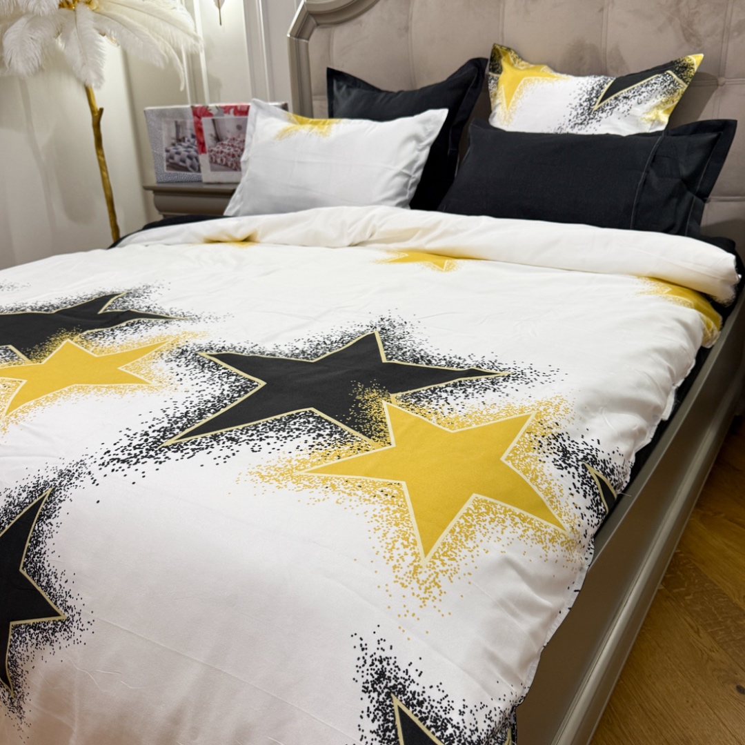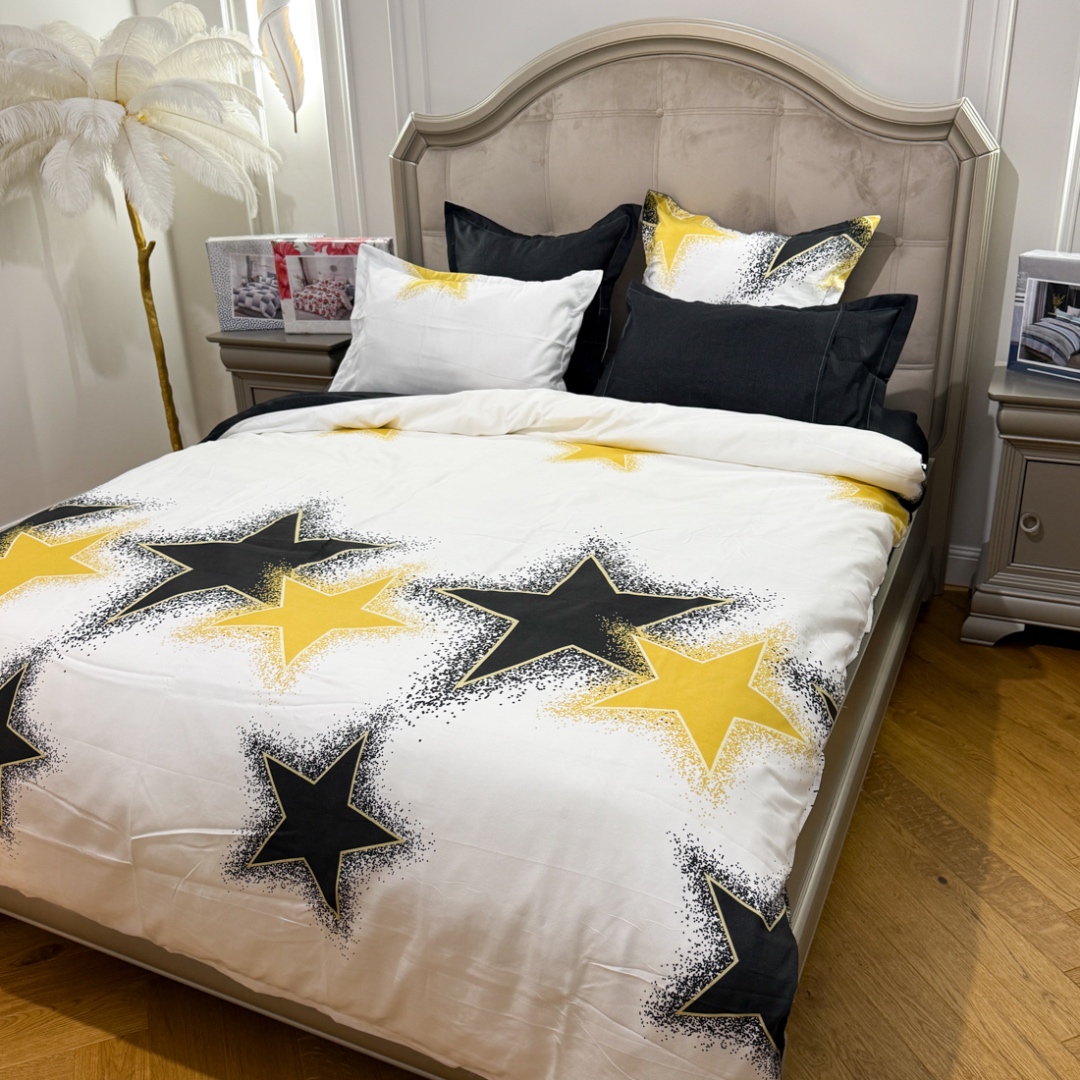 (OFERTA TRIO) Lenjerie Pat Dublu, FINET, 6 piese, Alb, Galben, Negru, Stelute
