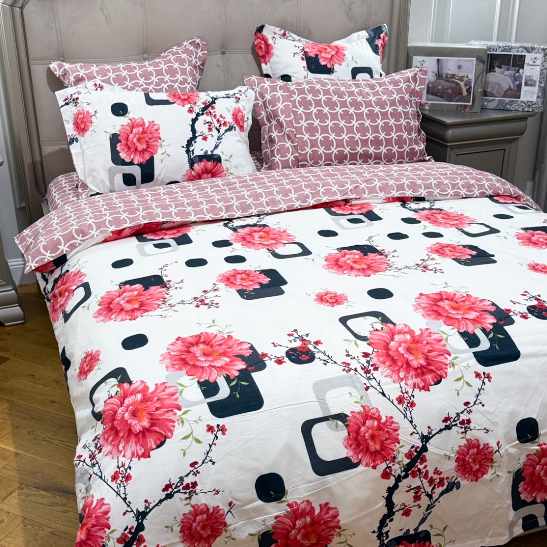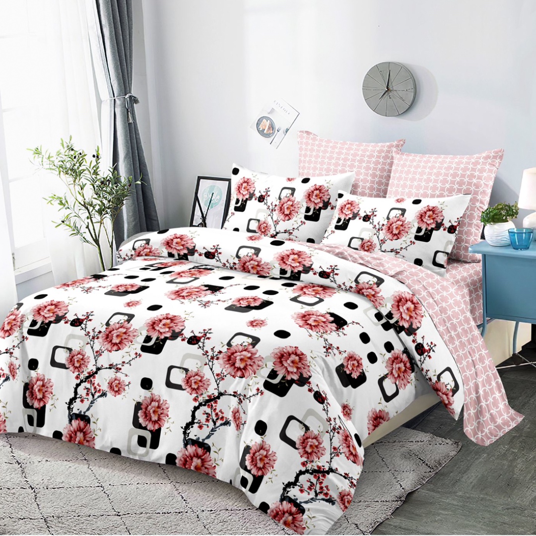 Lenjerie Pat Dublu, FINET, 6 piese, Alb, Roz, Negru, Flori, Patratele