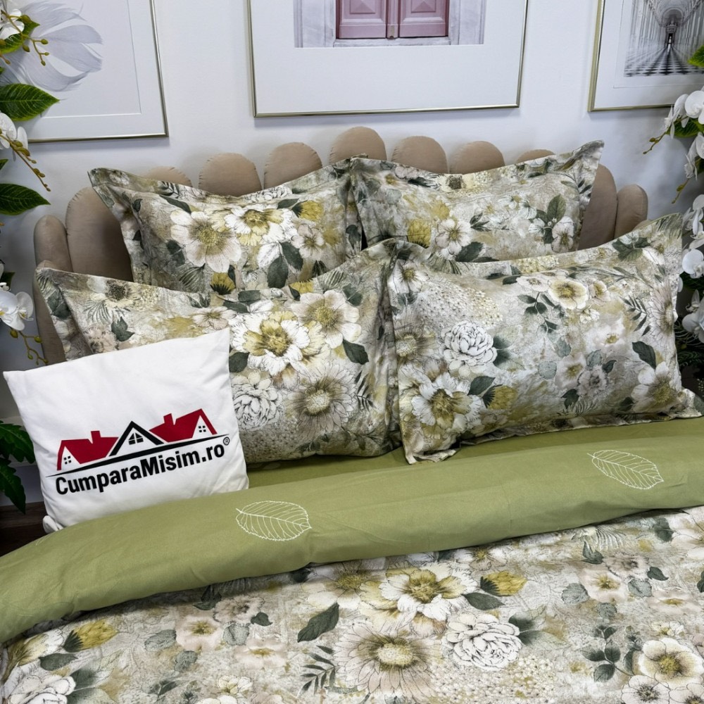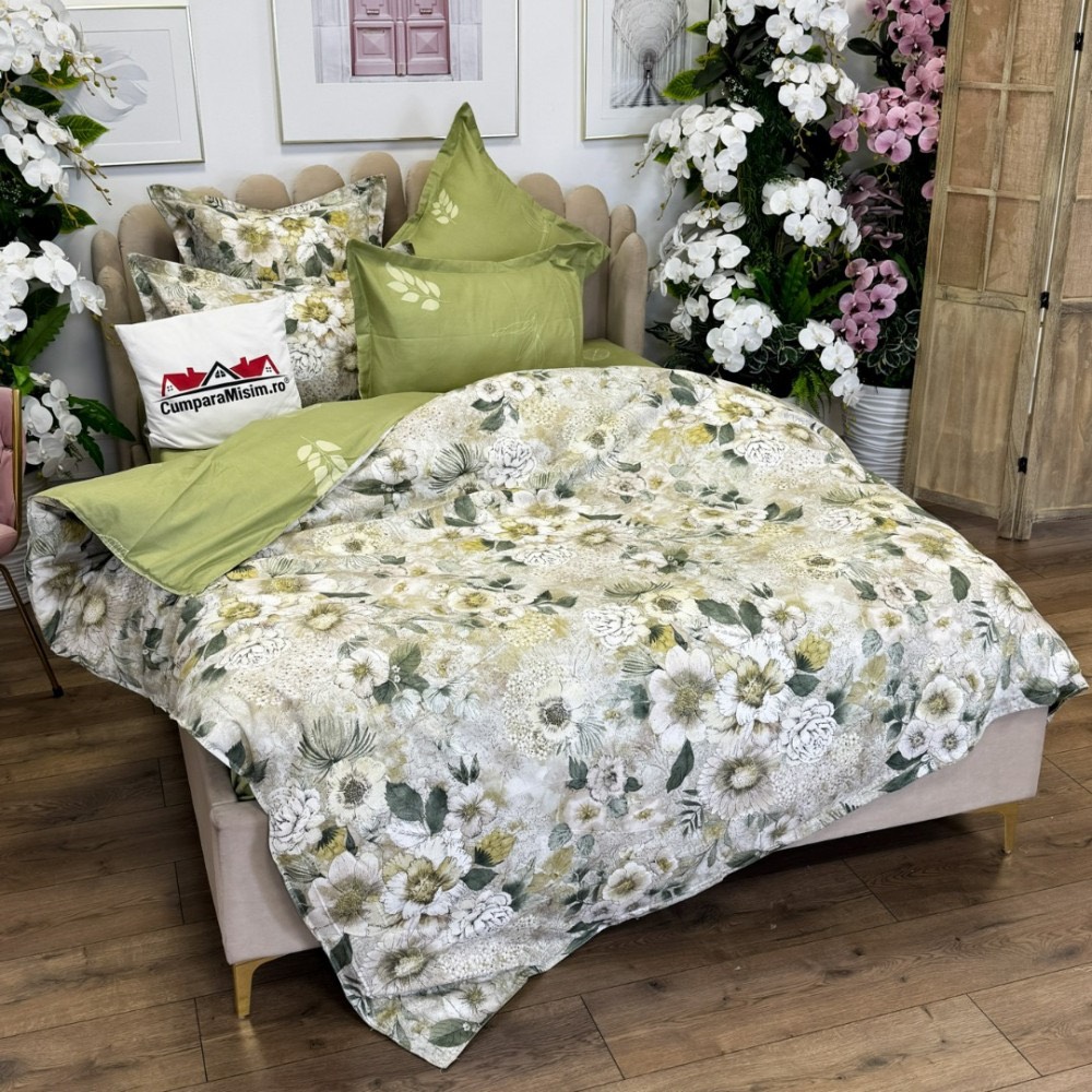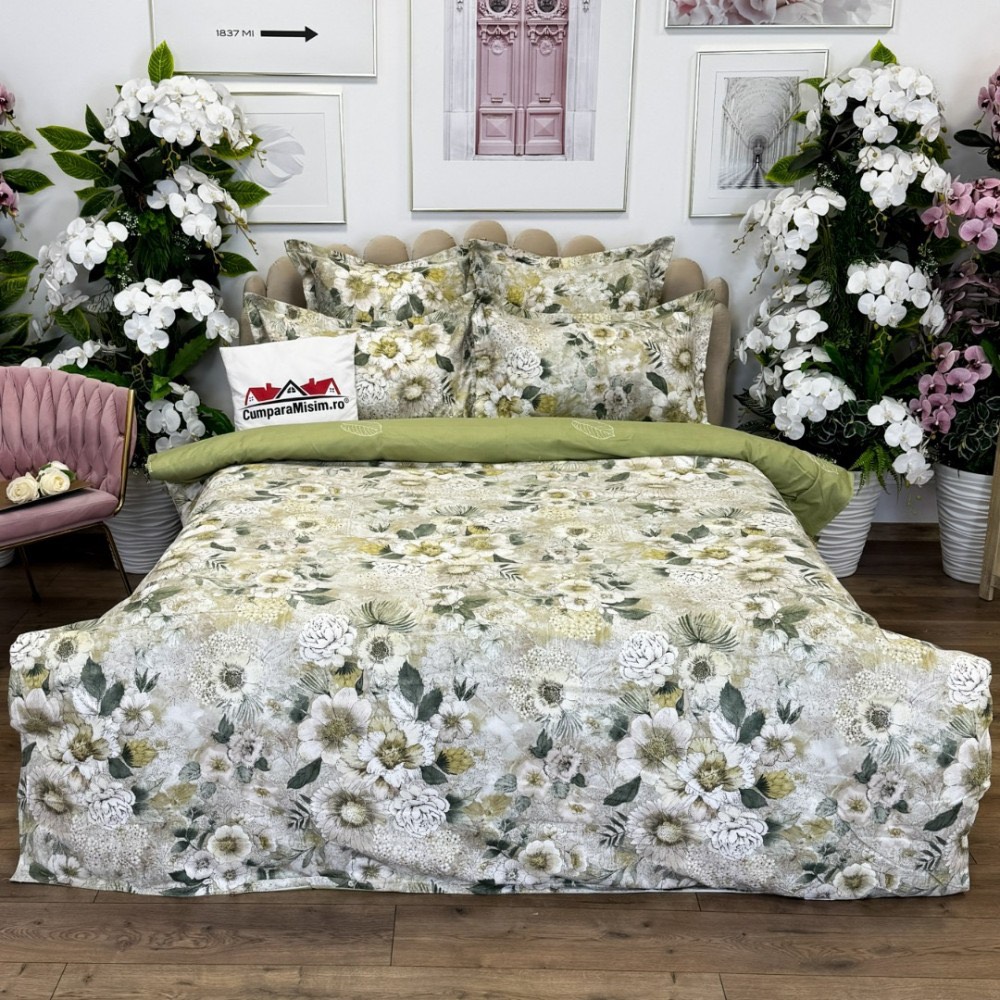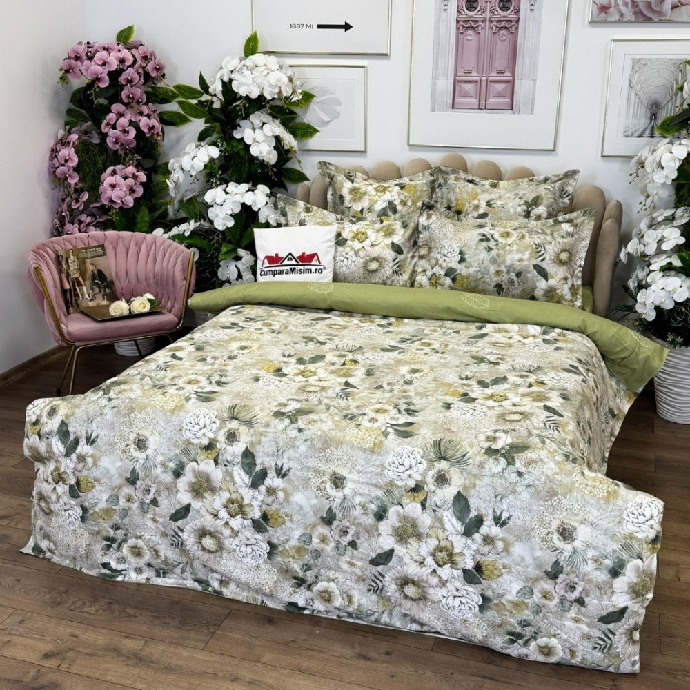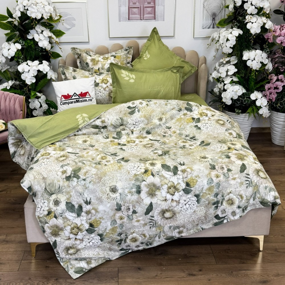 (OFERTA TRIO) Lenjerie Pat Dublu, FINET, 6 piese, Verde, Gri, Flori