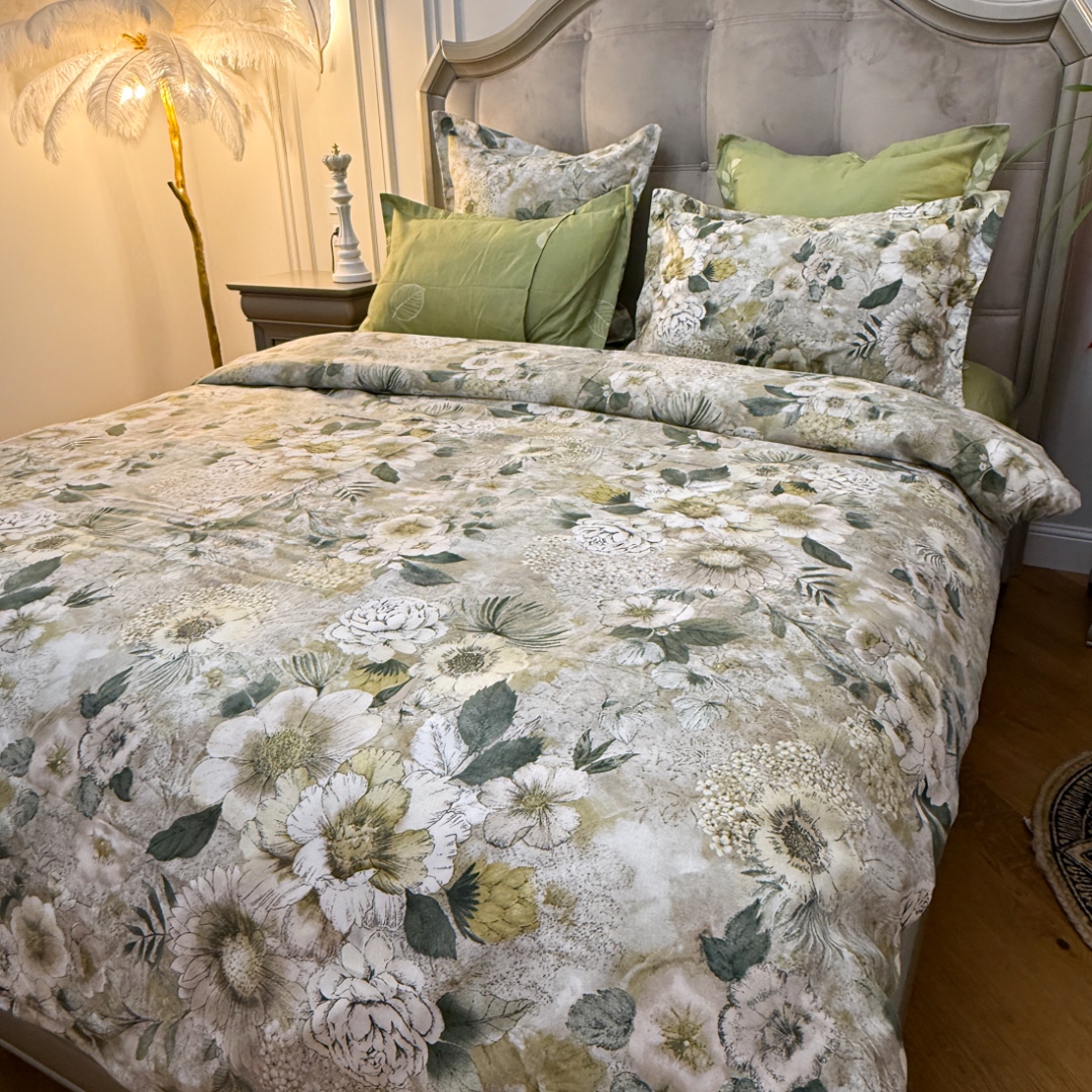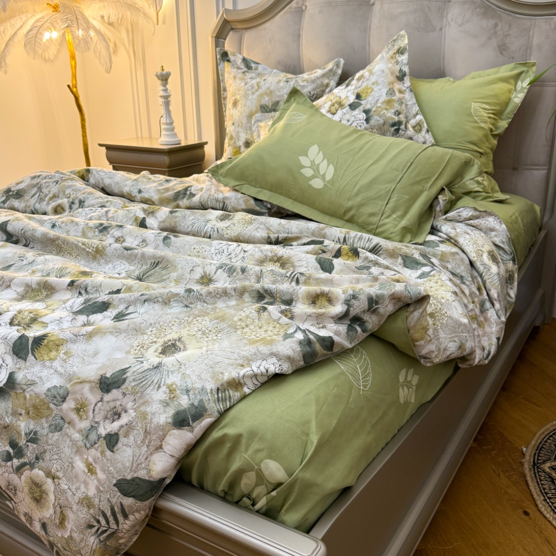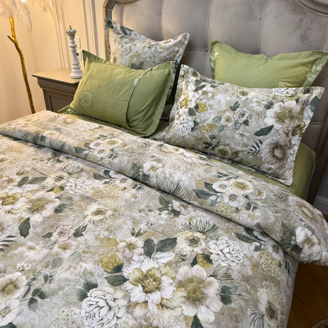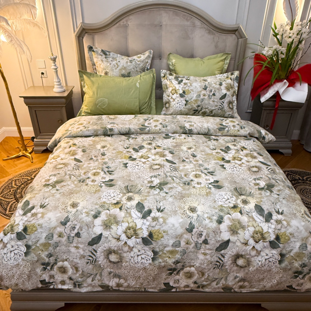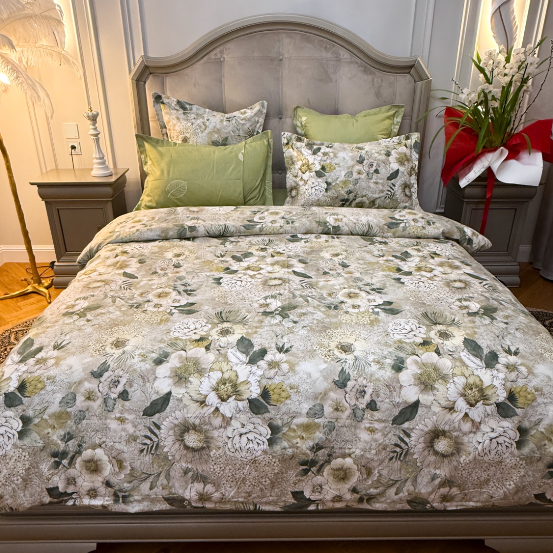(OFERTA TRIO) Lenjerie Pat Dublu, FINET, 6 piese, Verde, Gri, Flori