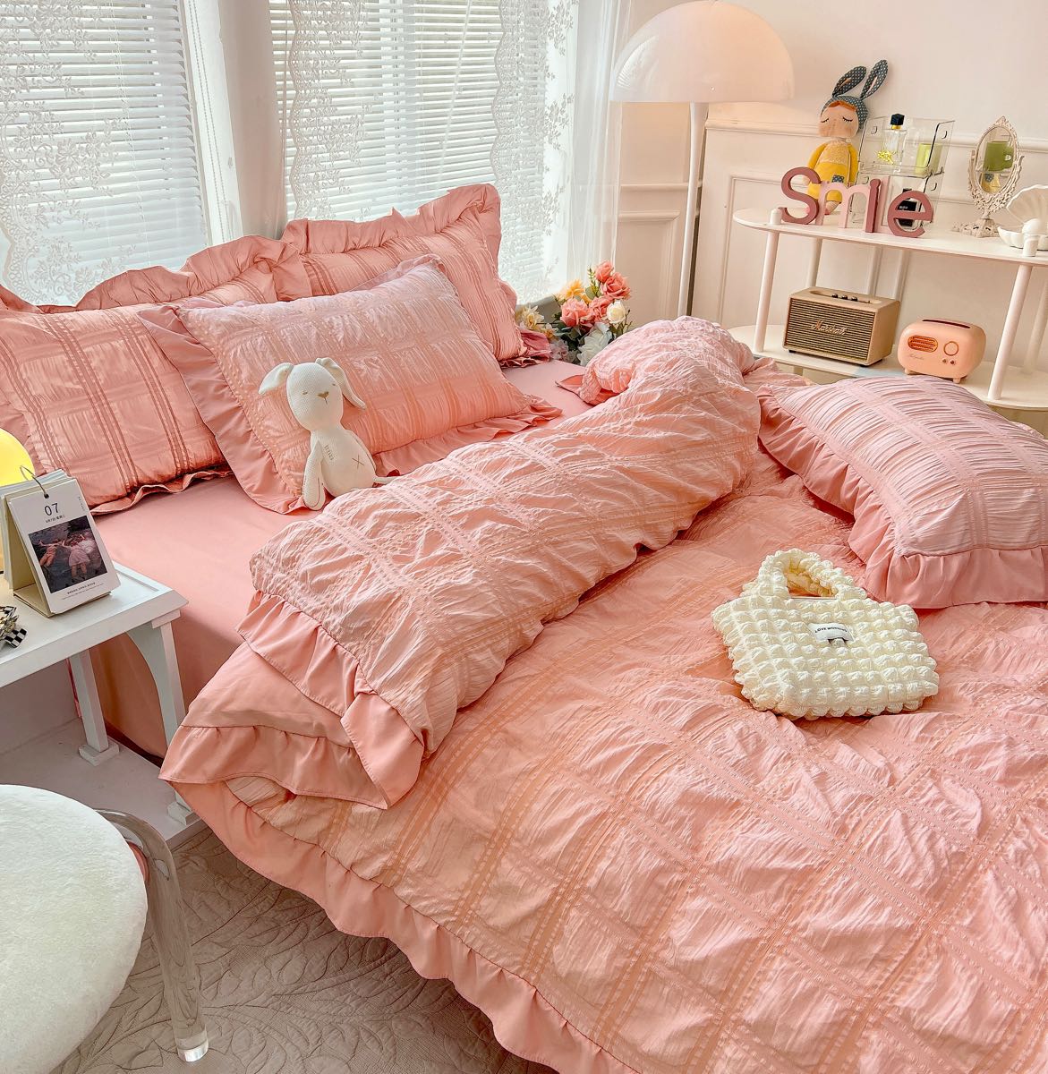 Lenjerie pat dublu, Soft Touch CREPONAT DELUXE, 6 piese, Jojo Home, Roz Pudra