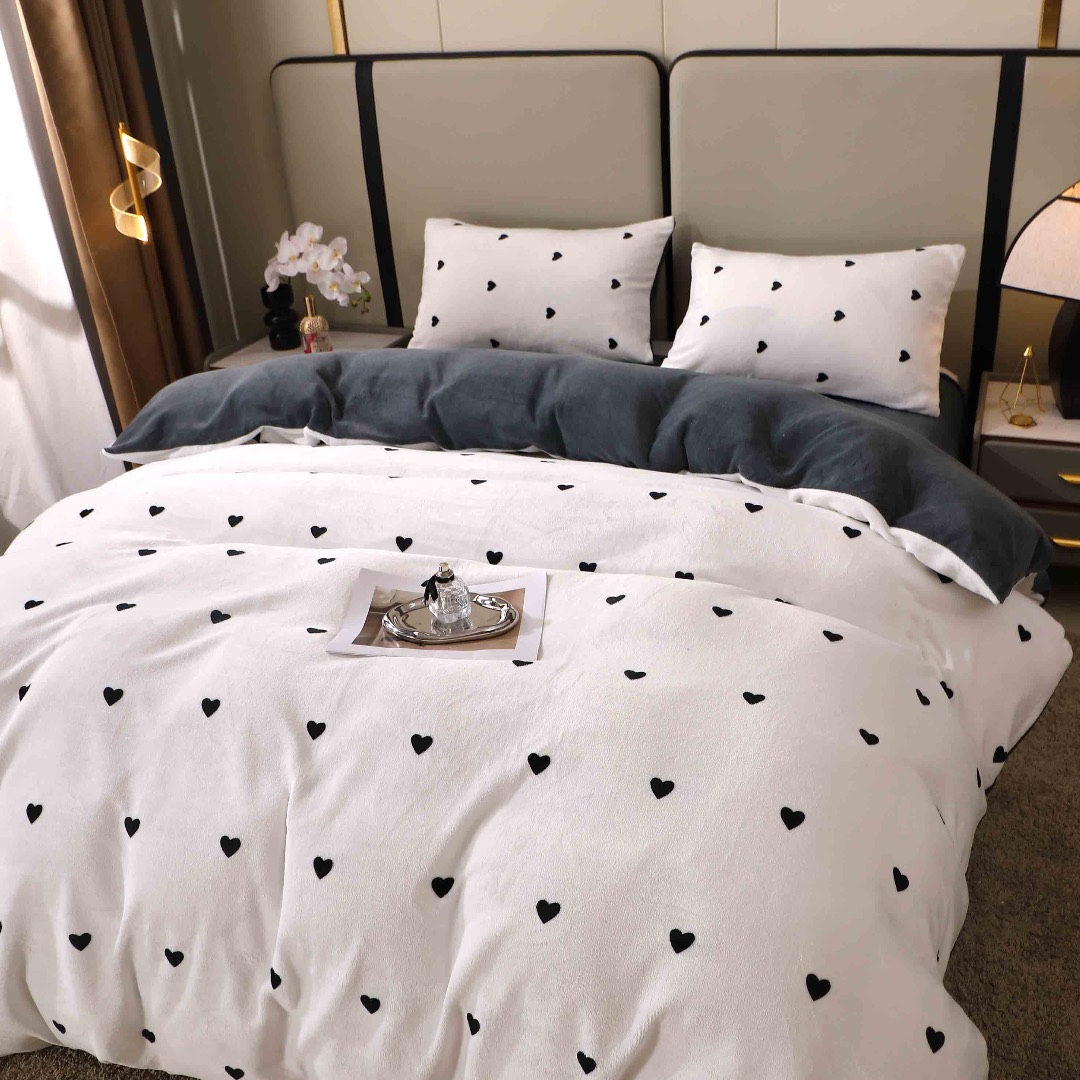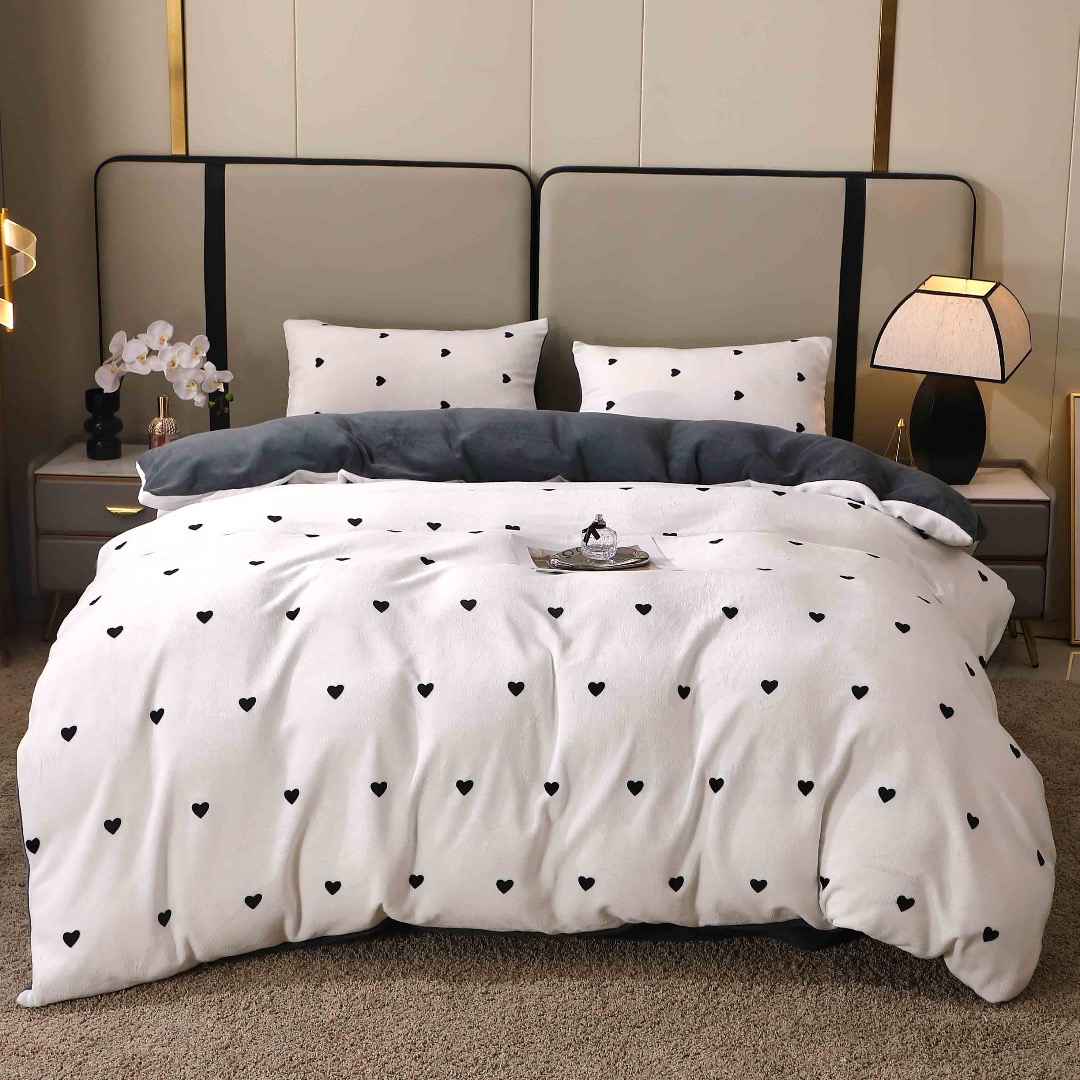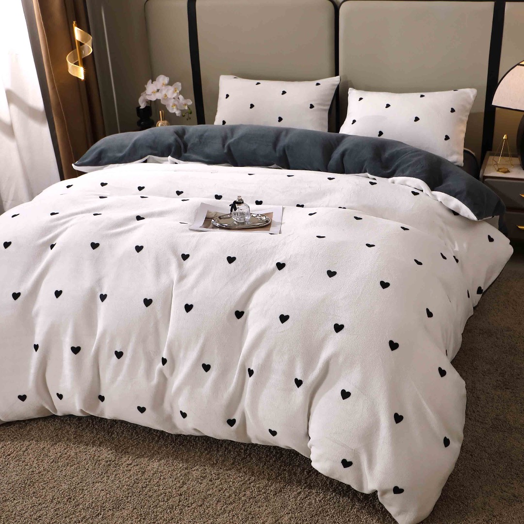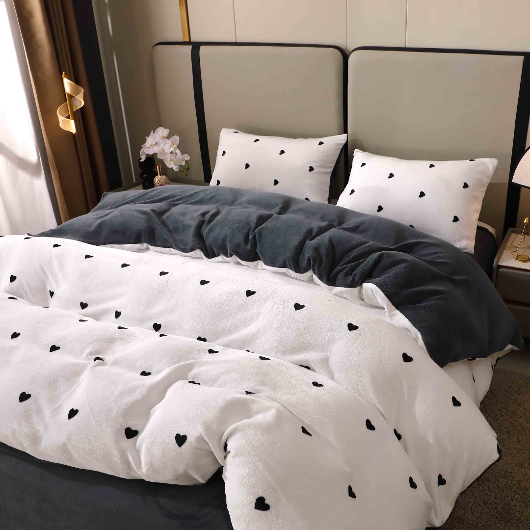 Lenjerie pat dublu, Super Pufoasa COCOLINO, 4 piese, Alb, Gri, Inimioare