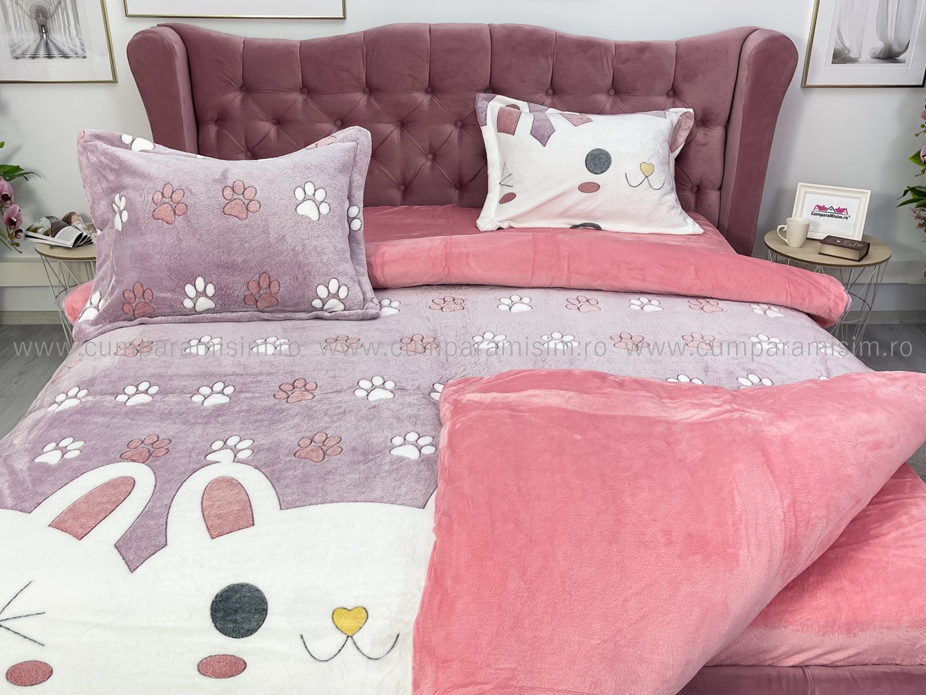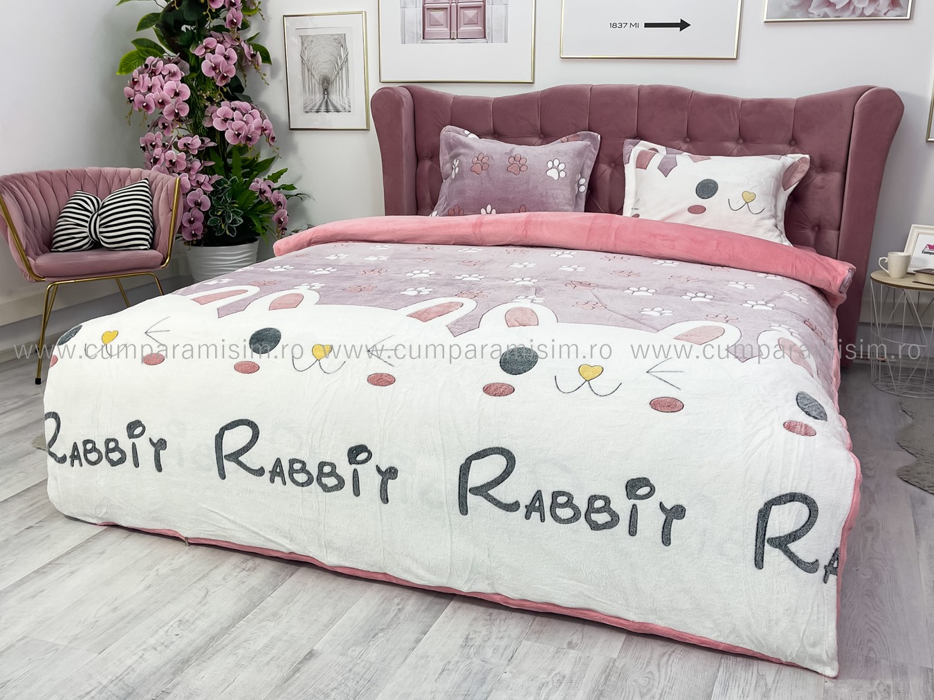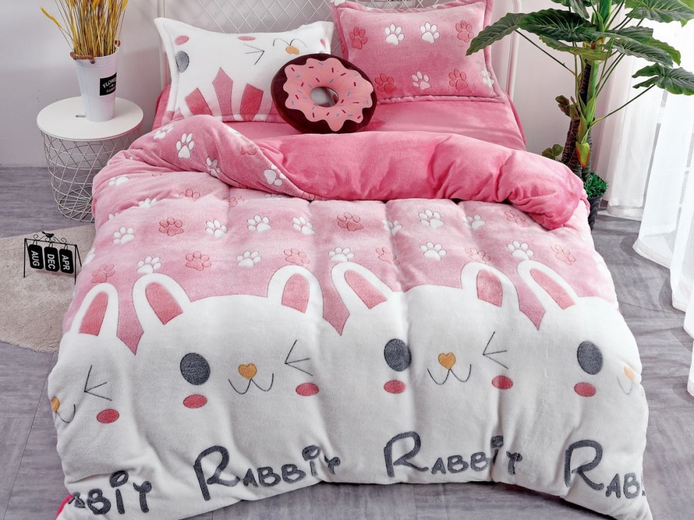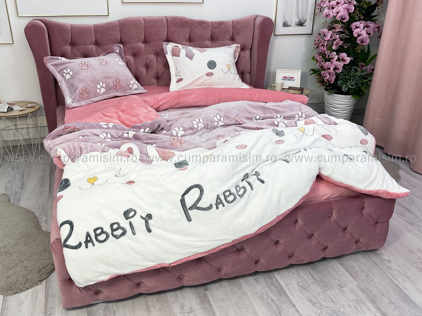 Lenjerie pat dublu, Super Pufoasa COCOLINO,cu ELASTIC, 4 piese, Jojo Home, Roz-Multicolor, iepurasi