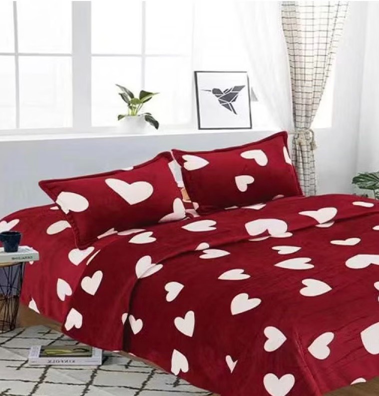 Lenjerie pat dublu, Super Pufoasa COCOLINO,cu ELASTIC, 4 piese, Rosu, inimioare
