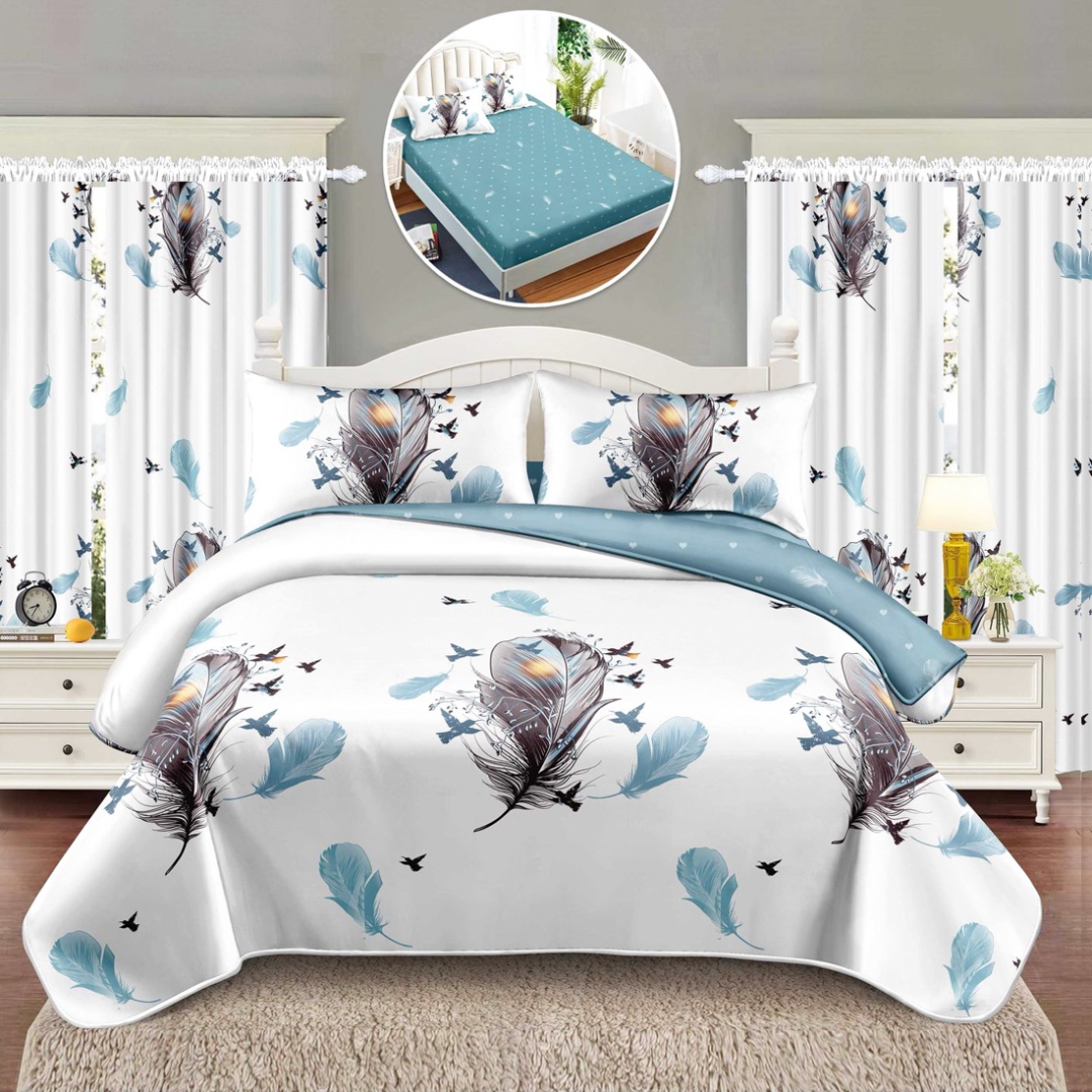 Set lenjerie de pat Matrimonial Compact (saltea 140x200 cm, pilota 160x200 cm) din bumbac finet, 6 piese, cu draperii incluse – Model fluturi Iti prezentam un set complet de lenjerie de pat din finet, format din 8 piese, inclusiv 2 draperii cu rejansa multifunctionala pentru o fixare usoara pe bara, dar si pe sina . Acest set unic are un design elegant si rafinat, care se regaseste atat pe lenjeria de pat, cat si pe draperii, oferind o armonie vizuala perfecta in dormitorul tau. Detal
