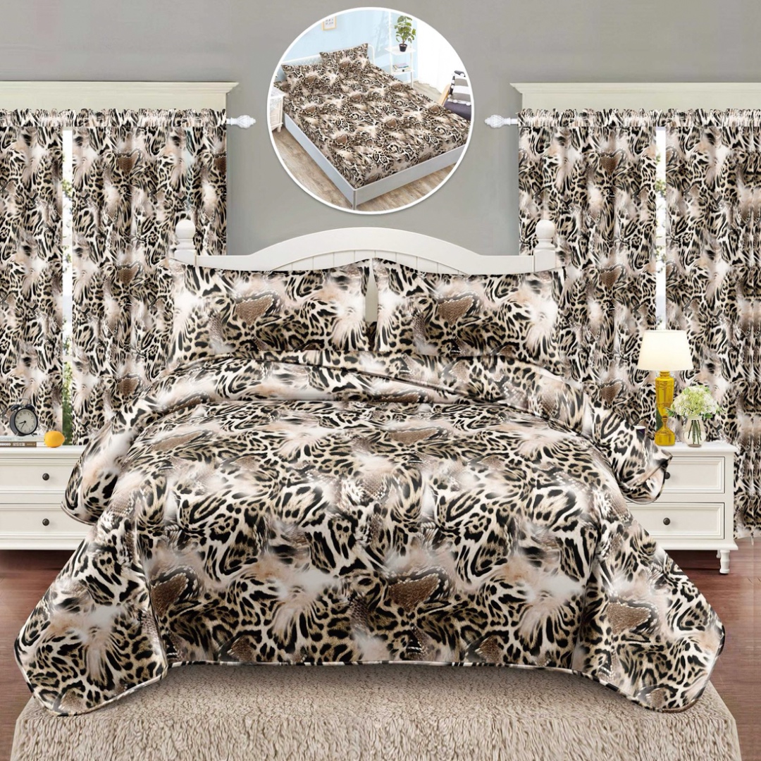 Set Lenjerie pat dublu cu Elastic (140x200cm) + 2 draperii, finet, 6 piese, Bej, Negru, Animal Print