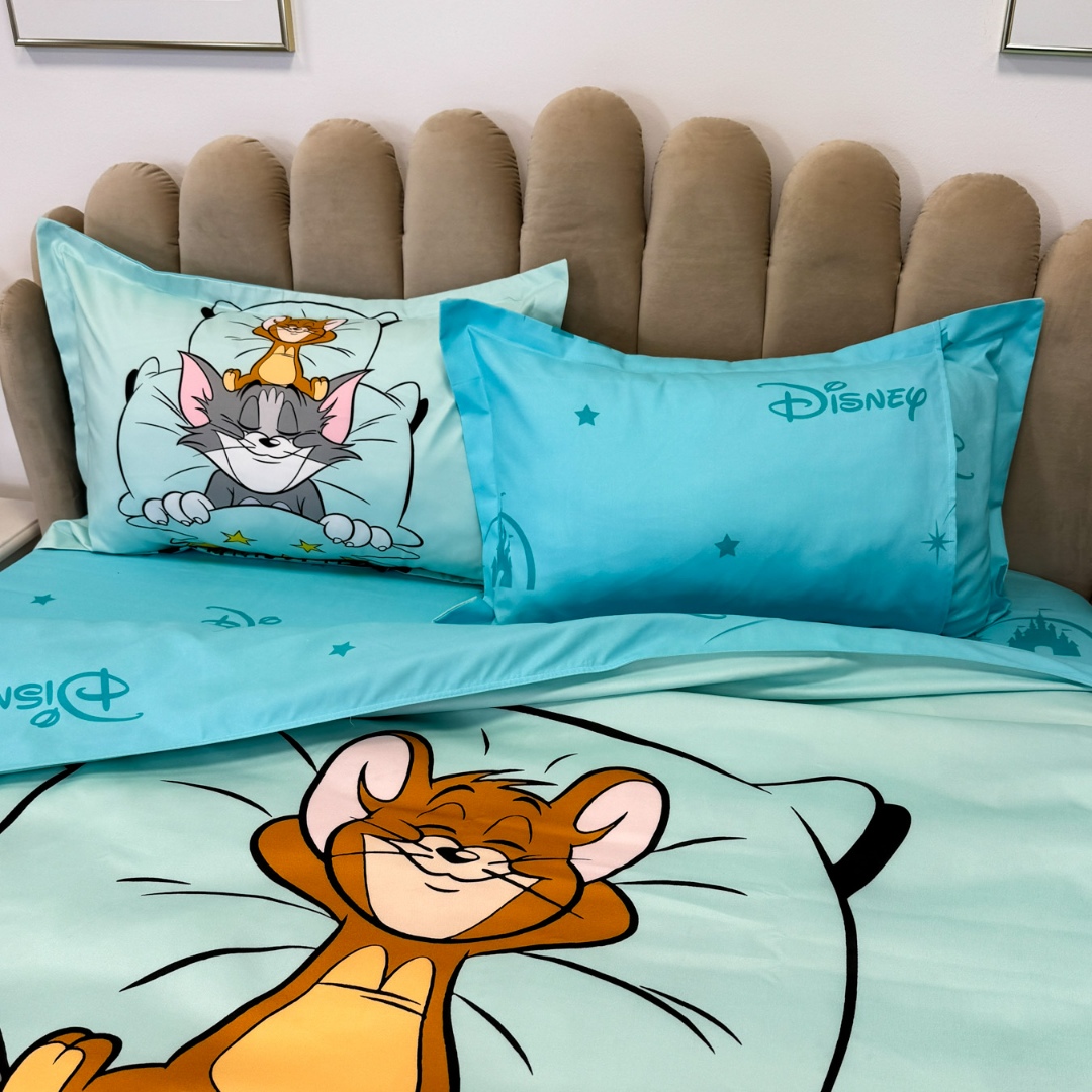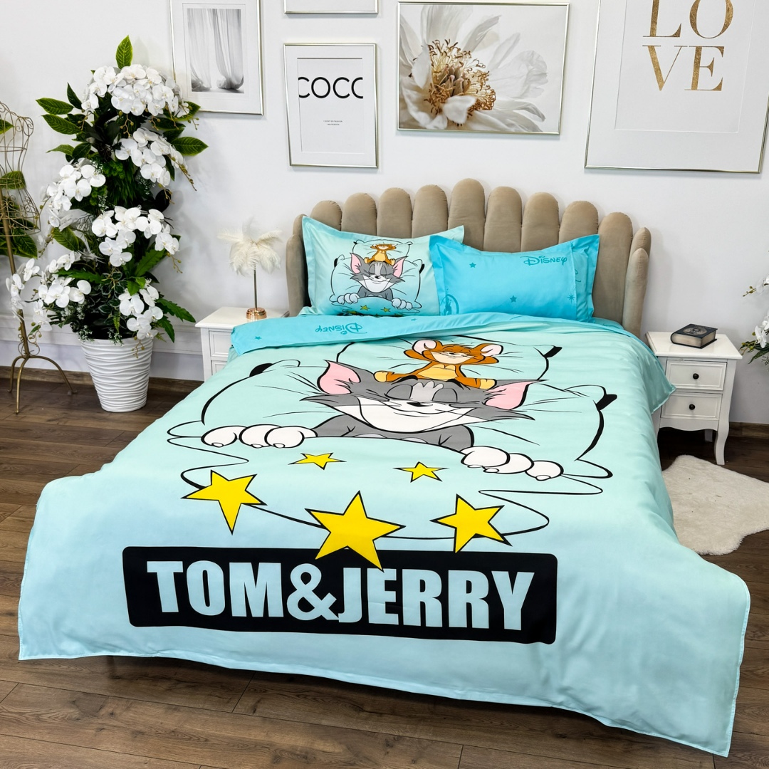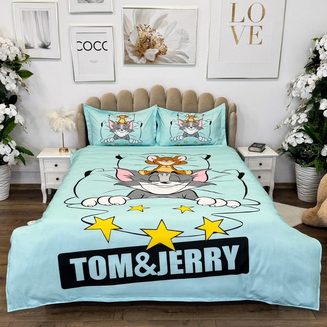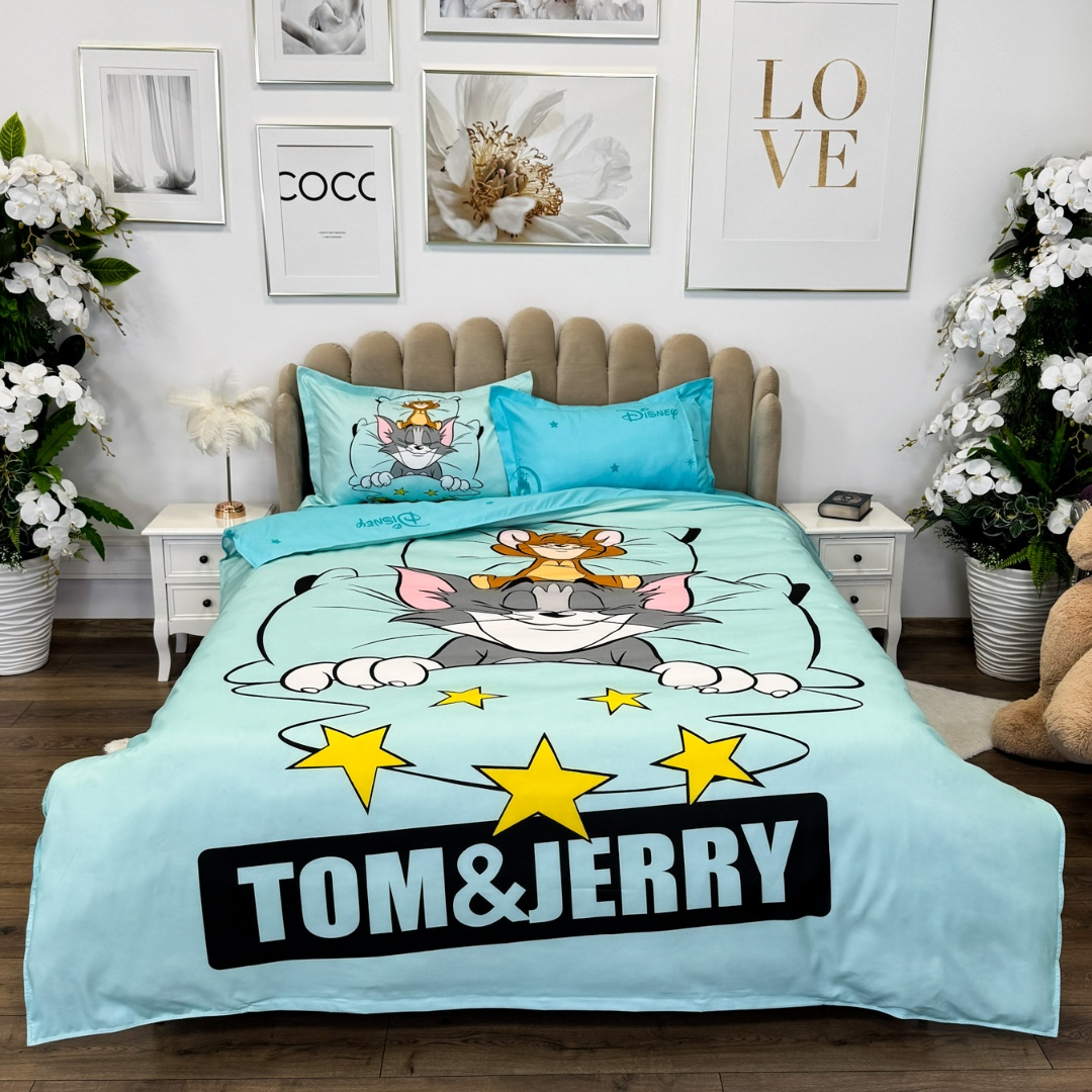 Lenjerie pat single (90x200cm, 100x200cm), FINET, 4 piese, IDENTICA CU POZA, Bleu, Tom si Jerry
