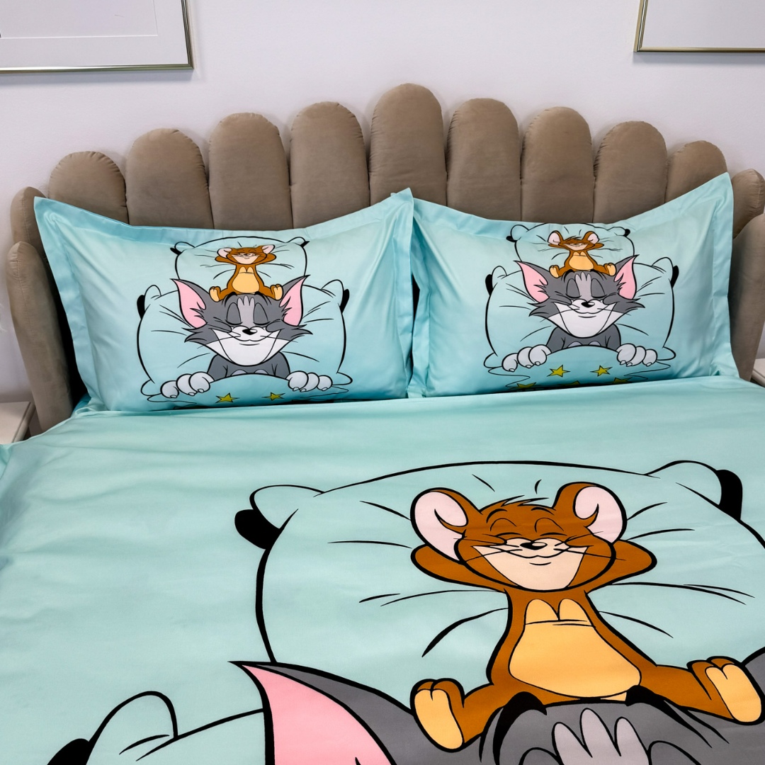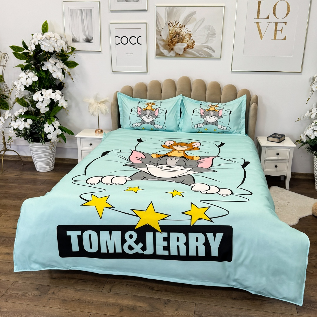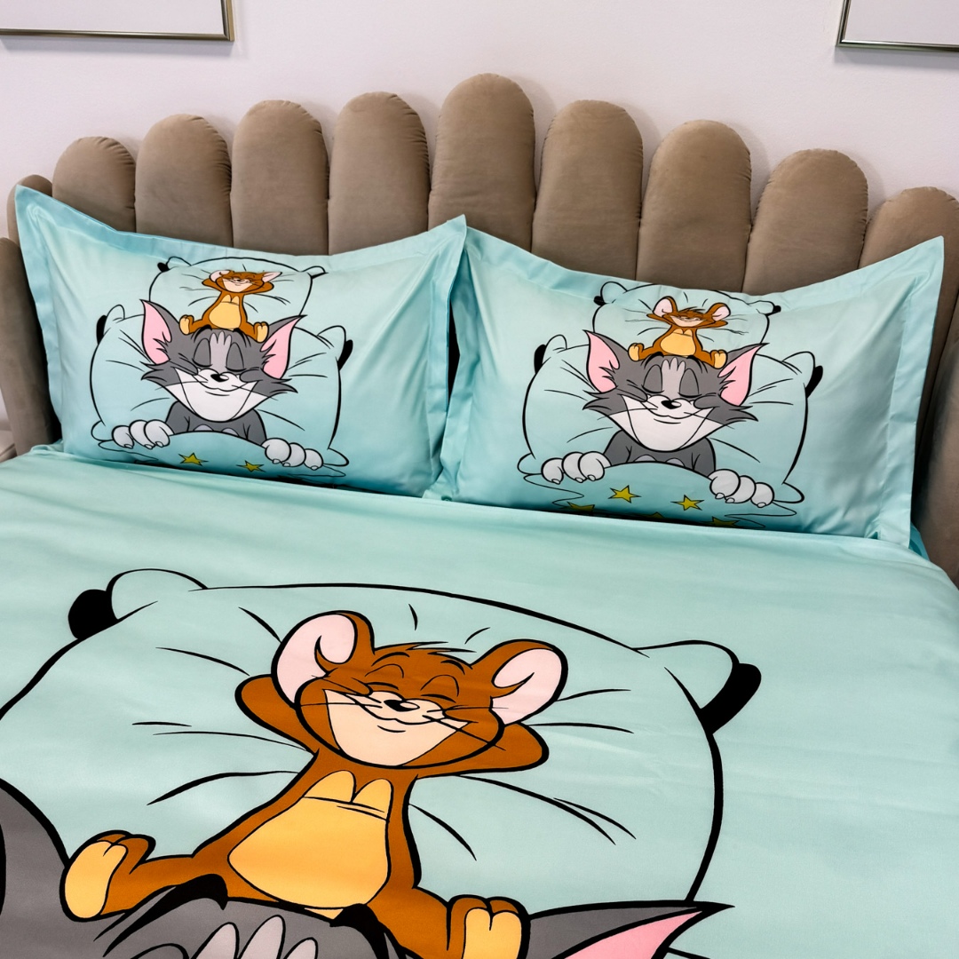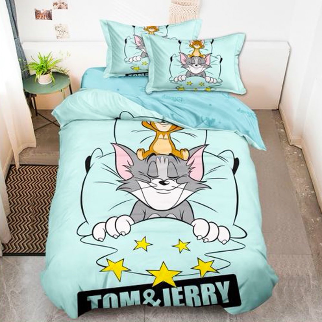 Lenjerie pat single (90x200cm, 100x200cm), FINET, 4 piese, IDENTICA CU POZA, Bleu, Tom si Jerry