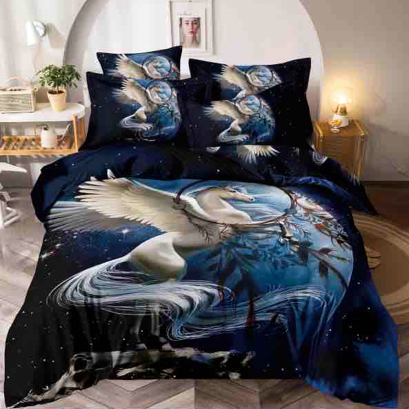 Lenjerie pat single, FINET, Imprimeu Digital - Identic cu poza, 4 piese, cu ELASTIC, Jojo Home, Alb-Bleumarin, unicorn