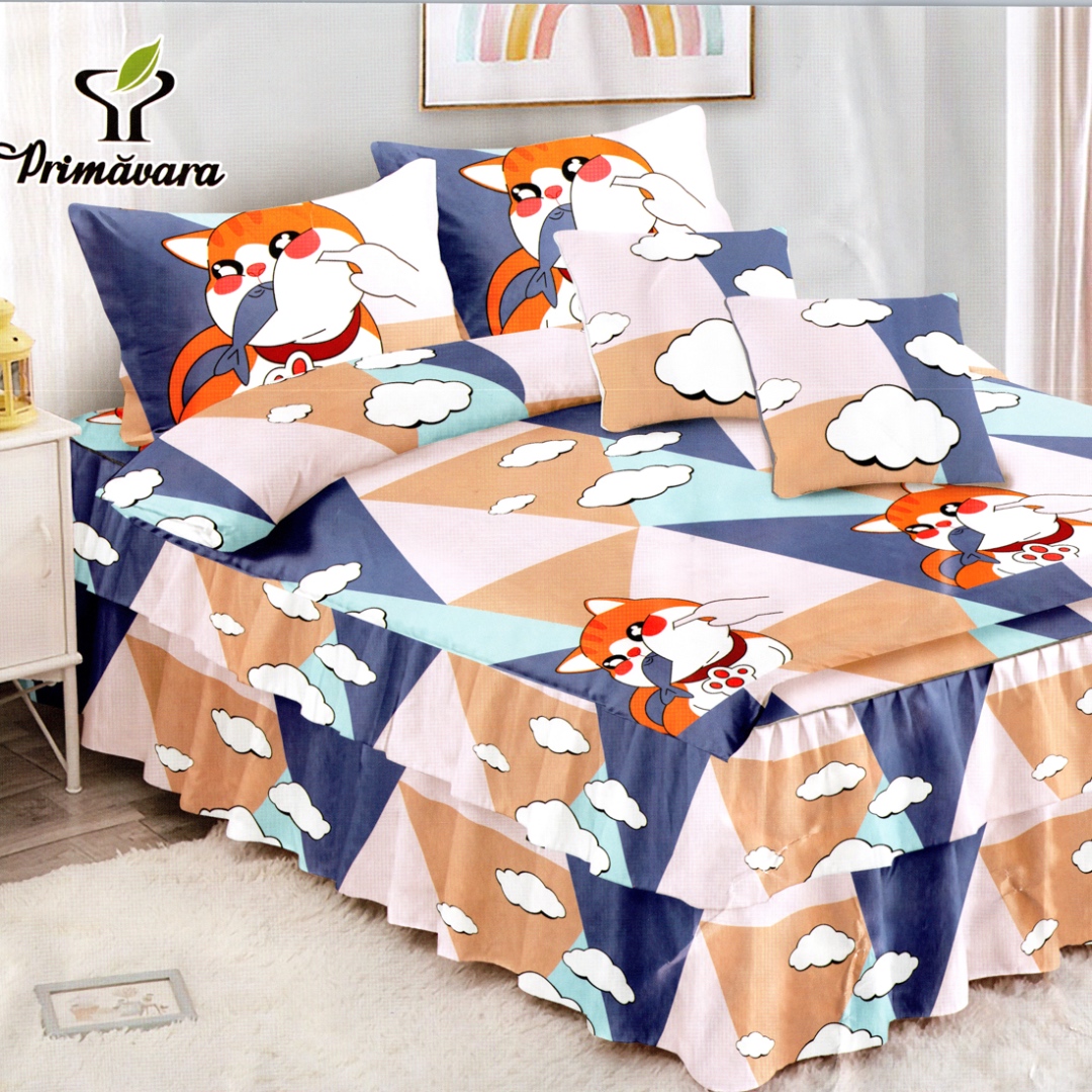(OFERTA TRIO) Lenjerie Premium Pat Dublu FINET, 6 Piese – Volanase Sofisticate, Fixare Perfecta cu Elastic, Bej, Albastru, Roz, Vulpite, Forme Geometrice, Norisori