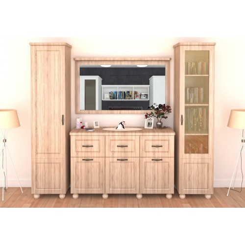 Dynasty este o alegere eleganta si practica pentru living-ul dumneavoastra. Usile si fetele de sertar sunt fabricate din MDF sonoma cu grosimea de 18 mm si sunt frezate pentru un aspect deosebit. Sticla de la vitrina este fumurie. Manerele metalice antichizate impreuna cu picioarele din lemn vopsit ofera de asemenea o eleganta aparte. Capacele comodelor si ornamentele din partea superioara a dulapurilor sunt fabricate din MDF sonoma cu grosimea de 25 mm pentru o rezistenta sporita, dar si pentru un aspect placut. Carcasele corpurilor sunt fabricate din PAL melaminat sonoma cu grosimea de 16 mm. Latimea totala a livingului este de 234 cm, adancimea este de 48 cm, iar inaltimea este de 216 cm. Piesele care formeaza livingul sunt (latime x inaltime x adancime): Dulap cu 1 usa (480 x 2161 x 471 mm), Comoda cu 3 usi si 3 sertare (1380 x 905 x 480 mm), Oglinda (1380 x 100 mm) si Vitrina cu 1 usa (480 x 2161 x 471 mm). Vitrina cu 1 usa si dulapul cu 1 usa au in interior cate 5 spatii de depozitare pe polite. Oglinda include in accesorii sistemele de prindere in perete, mai putin diblurile care se baga in perete si trebuie achizitionate in functie de tipul peretelui dvs. (beton, rigips, lemn etc.). *Nota: Schita de montaj nu se afla in interiorul coletului intre piesele de mobila. Schita de montaj o sa fie atasata pe spatele facturii.