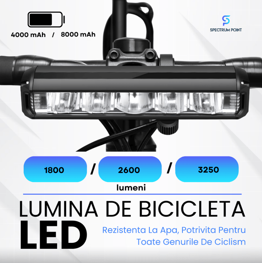 Lumina frontala profesionala bicicleta, luminozitate 1000 lumeni, baterie interna 2000 mAh, incarcare USB, negru