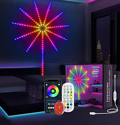 Lumini LED tip artificii inteligente, RGB Muzica, telecomanda si control din smartphone, multicolor Creati o atmosfera minunata pentru dvs. si bucurati-va de spectacolul de lumini. 16 milioane de culori, 213 moduri dinamice, sincronizare muzicala, microfon sau cronometru. 3 metode de control: Luminile LED tip artificii pot fi controlate prin telecomanda sau aplicatie. Prin telecomanda si aplicatie, puteti porni sau opri luminile, reglati luminozitatea, alegeti culori / modele dinamice, viteza de redare a luminii, temporizator, moduri de muzica si microfon etc. Cu ajutorul panoului de control, puteti porni / opri luminile si schimba modurile. Usor de instalat: Trebuie doar sa rupeti banda de pe spatele luminilor si sa o lipiti, apoi conectati-o la sursa de alimentare pentru a o utiliza. *Aplicatia este sub forma de COD QR si se afla pe adaptor. Instalatie LED artificii RGB, muzica, telecomanda si control din smartphone, multicolor