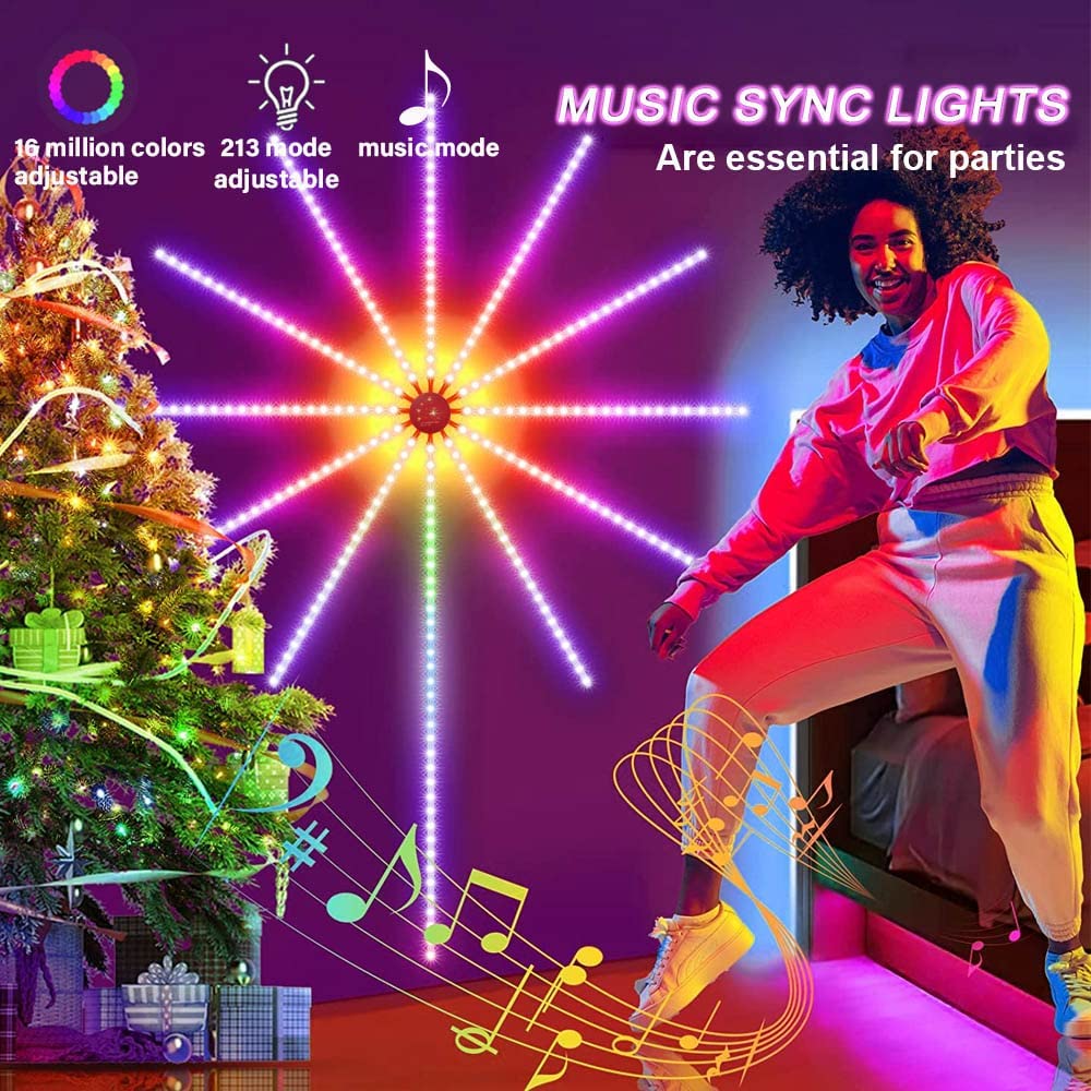 Lumini LED tip artificii inteligente, RGB Muzica, telecomanda si control din smartphone, multicolor Creati o atmosfera minunata pentru dvs. si bucurati-va de spectacolul de lumini. 16 milioane de culori, 213 moduri dinamice, sincronizare muzicala, microfon sau cronometru. 3 metode de control: Luminile LED tip artificii pot fi controlate prin telecomanda sau aplicatie. Prin telecomanda si aplicatie, puteti porni sau opri luminile, reglati luminozitatea, alegeti culori / modele dinamice, viteza de redare a luminii, temporizator, moduri de muzica si microfon etc. Cu ajutorul panoului de control, puteti porni / opri luminile si schimba modurile. Usor de instalat: Trebuie doar sa rupeti banda de pe spatele luminilor si sa o lipiti, apoi conectati-o la sursa de alimentare pentru a o utiliza. *Aplicatia este sub forma de COD QR si se afla pe adaptor.