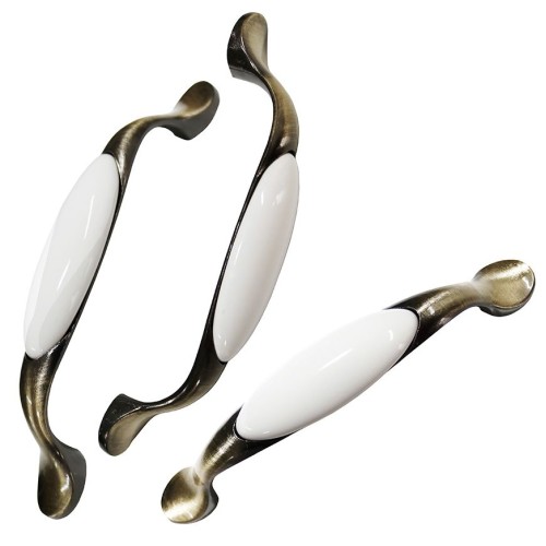 Maner din aliaj de zinc placat cu alama antica si ornament din ceramica fara print. Include suruburi pentru prindere pe frontul de mobila (usa sau sertar) de 18 mm. Pretul este pentru 50 de bucati. CARACTERISTICI Dimensiune intre gauri: 96 mm Greutate: 43.6 grame