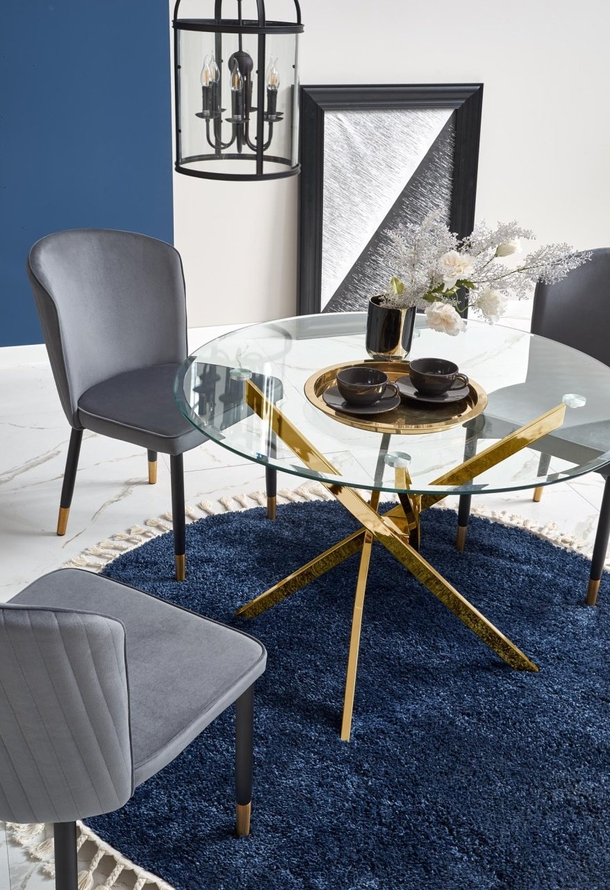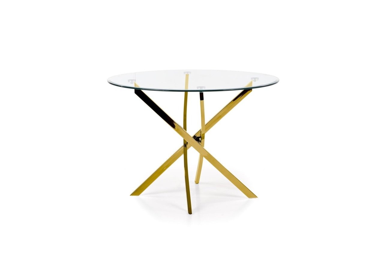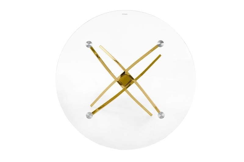 Masa rotunda sticla Raymond gold - d 100 x h 73 cm Masa Raymond are un design elegant fiind potrivita pentru interioarele moderne si clasice. Masa se integreaza perfect in livingul dumneavoastra avand un impact vizual puternic, fiind alegerea perfecta pentru cei care opteaza pentru un aspect glamour. Dimensiuni: Diametru: 100 cm Inaltime: 73 cm Detalii tehnice: Produsul este realizat pe structura de otel cromat, iar blatul din sticla Culoare: Sticla Transparenta / Gold Produsul nu este montat. Instructiunile de montaj se gasesc in colet.