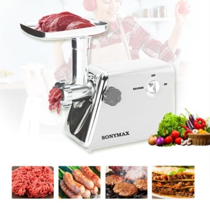 Masina electrica de tocat carne Meat Grinder SonyMax 2200W - SN4001 masina de tocat carne model SonyMax 2200W - SN4001 putere totala: 2200 W cutit din otel inoxidabil tava de alimentare metalica 3 discuri cu gauri de diametre diferite (fin - 2.7 mm, mediu - 4 mm, grosier - 8 mm) functie de mers inapoi (pentru deblocare) accesorii pentru carnati si chiftele (sau kebab) lungime cablu alimentare: 1 metru culoare: Alb greutate neta: 2.69 kg