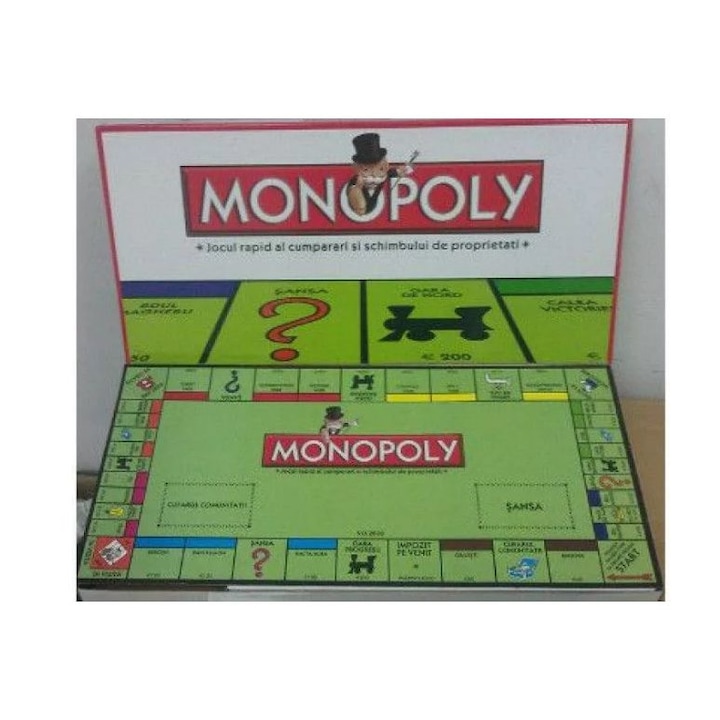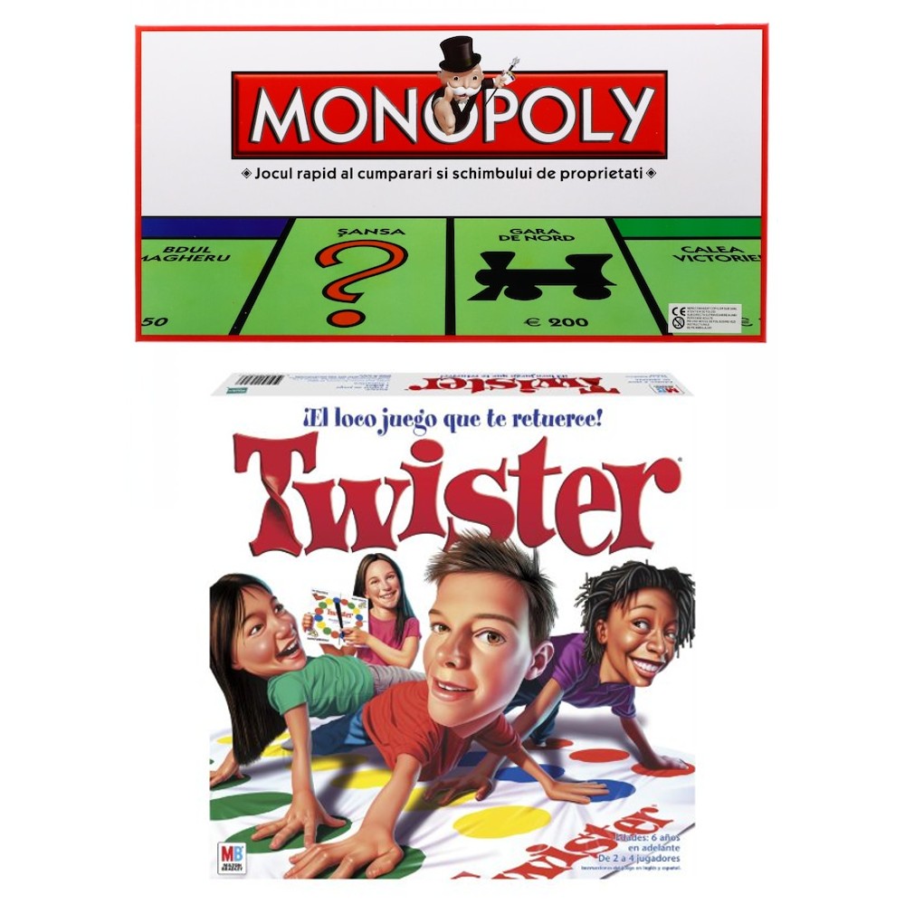 Set jocuri de societate pentru copii sau adulti Joc de societate Monopoly + Joc de coordonare Twister Joc de societate Monopoly Dimensiune cutie 43×22 cm Joc de societate Monopoly cu proprietati din Bucuresti. . Fii alaturi de personajele preferate in timp ce te distrezi cu jocul Monopoly. Joc de societate in care: cumperi, vinzi, inchiriezi proprietati, construiesti Numar de jucatori: 2-8 Traieste viata agitata a unui agent imobiliar in lumea ametitoare a tranzactiilor imobiliare! Fa turul orasului cautand cele mai bune proprietati: terenuri, statii si utilitati gata sa fie luate in stapanire.Investete in case si hoteluri, apoi priveste cum venitul creste! Fa intelegeri cu alti jucatori si fii atent la oferte bune la licitatii, sunt multe posibilitati de a obtine ceea ce vrei. Cumpara si vinde pentru a avea succes, poti sa detii totul! Foloseste zarul rapid pentru cea mai rapida si intensa experienta MONOPOLY. Ce mai astepti? Fa targul sau da zarul mai departe.Trebuie sa te misti repede in afacerile imobiliare! Jocul contine: Placa de joc, 8 carduri 28 Titluri de proprietate 16 Carduri Cufarul Comunitatii 1 pachet de bani 32 case verzi, 12 hoteluri rosii 1 zar, 1 zar de viteza Instructiuni de joc Joc Twister: Se joaca in 2 pana la 4 jucatori. Insa cu cat sunt mai multi participanti,cu atat jocul devine mai distractiv Jocul este alcatuit dintr-o panza de plastic care sta intinsa pe podea si care contine 24 de cercuri dispuse liniar: 6 culoare rosie 6 culoare galbena 6 culoare albastra 6 culoare verde Contine si o bucata de carton patrata, impartita in 4 sectiuni (rosu, galben, albastru si verde) care reprezinta pe rand: piciorul stang, piciorul drept, mana stanga, mana dreapta. De acest carton este atasat un ac de plastic care indica mutarile si care va fi invartit pentru fiecare miscare de un arbitru. Fiecarei sectiuni din cadran ii corespunde urmatoarea miscare pe care jucatorii trebuie sa o faca. Cu cat jocul avanseaza mai mult cu atat devine mai greu si mai incurcat si cu cat sunt mai multi jucatori cu atat devine mai interesant si mai distractiv.