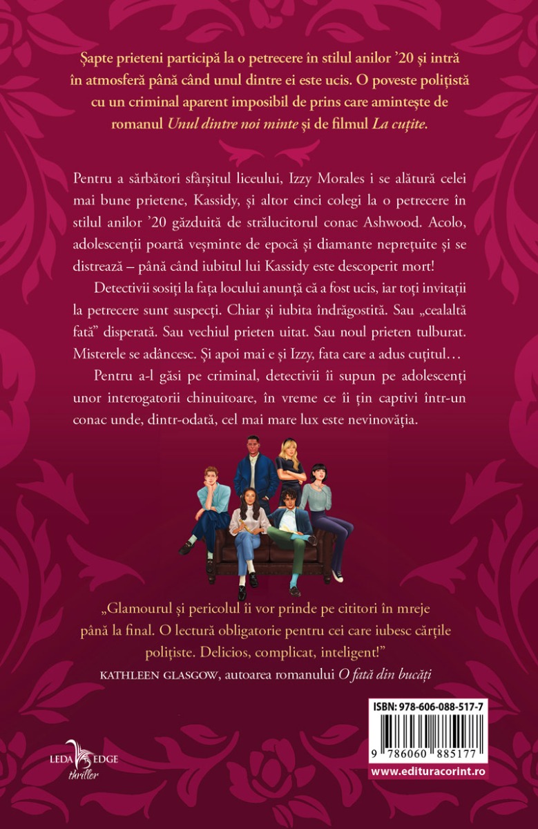 <p>Pentru a sărbători sfârșitul liceului, Izzy Morales i se alătură celei mai bune prietene, Kassidy, și altor cinci colegi la o petrecere în stilul anilor ’20 găzduită de strălucitorul conac Ashwood. Acolo, adolescenții poartă veșminte de epocă și diamante neprețuite și se distrează – până când iubitul lui Kassidy este descoperit mort!</p> <p>Detectivii sosiți la fața locului anunță că a fost ucis, iar toți invitații la petrecere sunt suspecți. Chiar și iubita îndrăgostită. Sau „cealaltă fată” disperată. Sau vechiul prieten uitat. Sau noul prieten tulburat. Misterele se adâncesc. Și apoi mai e și Izzy, fata care a adus cuțitul…</p> <p>Pentru a-l găsi pe criminal, detectivii îi supun pe adolescenți unor interogatorii chinuitoare, în vreme ce îi țin captivi într-un conac unde, dintr-odată, cel mai mare lux este nevinovăția.</p> <p> </p> <p>„Glamourul și pericolul îi vor prinde pe cititori în mreje până la final. O lectură obligatorie pentru cei care iubesc cărțile polițiste. Delicios, complicat, inteligent!” Kathleen Glasgow, autoarea romanului <em>O fată din bucăți</em></p> <p> </p> <p> „<em>O crimă neașteptată</em> combină stilul Agathei Christie cu suspansul lui Karen M. McManus în acest captivant roman polițist. Muñoz surprinde spiritul thrillerului clasic, țesând cu îndemânare firele narațiunii, fără a pierde vreun detaliu important. Un debut de luat în seamă al unei voci promițătoare!” <em>Booklist</em></p> <p><em> </em></p> <p>„Pe lângă misterul principal, autoarea aduce în discuție în mod inspirat o serie de probleme grave, cum ar fi abuzul de substanțe toxice, pericolele sexului neprotejat și abuzurile celor care se bucură de privilegii</p> <p>socio-economice. […] Un thriller dulce-amărui pe care nu îl mai poți lăsa din mână!” <em>Kirkus Reviews</em></p> <p> </p> <p>„În acest roman polițist clasic, autoarea debutantă Muñoz vine cu o poveste care te va ține cu sufletul la gură. […] Atenția acordată de Muñoz dinamicii dintre diferite clase sociale, dar și loialității, ancorează întâmplările în realitate. Strunind cu pricepere tensiunea cu ajutorul unor indicii bine plasate și dialoguri captivante, scriitoarea cultivă în mod credibil</p> <p>dezvăluirile șocante și deciziile dificile.” <em>Publishers Weekly</em></p>