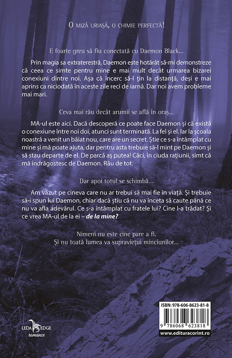 NEW YORK TIMES BESTSELLER O miză uriaşă, o chimie perfectă E foarte greu să fiu conectată cu Daemon Black… Prin magia sa extraterestră, Daemon este hotărât să-mi demonstreze că ceea ce simte pentru mine e mai mult decât urmarea bizarei conexiuni dintre noi. Aşa că încerc să-l ţin la distanţă, deşi e mai aprins ca niciodată în aceste zile reci de iarnă. Dar noi avem probleme mai mari. Ceva mai rău decât arumii se află în oraş… MA-ul este aici. Dacă descoperă ce poate face Daemon şi că există o conexiune între noi doi, atunci sunt terminată. La fel şi el. Iar la şcoala noastră a venit un băiat nou, care are un secret. Ştie ce s-a întâmplat cu mine şi mă poate ajuta, dar pentru asta trebuie să-l mint pe Daemon şi să stau departe de el. De parcă aş putea! Căci, în ciuda raţiunii, simt că mă îndrăgostesc de Daemon. Rău de tot. Dar apoi totul se schimbă… Am văzut pe cineva care nu ar trebui să mai fie în viaţă. Şi trebuie să-i spun lui Daemon, chiar dacă ştiu că nu va înceta să caute până ce nu va afla adevărul. Ce s-a întâmplat cu fratele lui? Cine l-a trădat? Şi ce vrea MA-ul de la ei – de la mine? Nimeni nu este cine pare a fi. Şi nu toată lumea va supravieţui minciunilor…