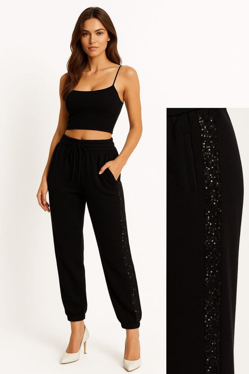 Pantaloni cu dunga laterala cu paiete, cu snur in talie si elastic jos. Origine :Turcia