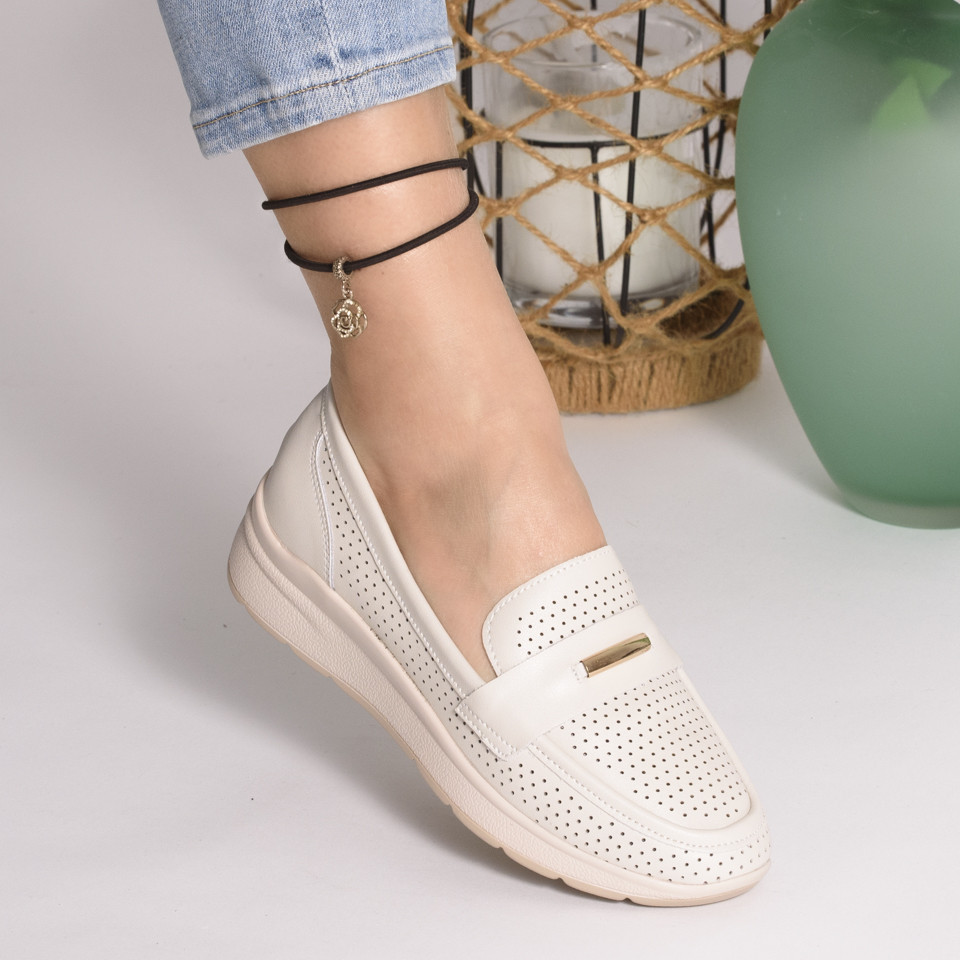 ✅ Culoare: Alb ✅ Material: piele naturala ✅ Inaltime fata: 2,5 cm ✅ Inaltime spate: 5 cm ✅ Stil: casual ✅ INFO Pantofii casual din piele naturală sunt o alegere excelentă pentru o gamă largă de evenimente informale, dar și pentru a fi purtați în viața de zi cu zi. Acești pantofi sunt realizati din piele naturală de înaltă calitate, ceea ce îi face durabili și confortabili. În plus, pielea naturală are un aspect elegant și rafinat care poate să completeze cu succes orice ținută casual.