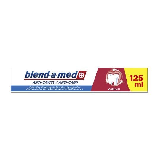 Pasta de dinti Blend-a-Med Anti-cavity Original, 125 ml Blend-a-med Anti-Cavitate Original pasta de dinti pentru intreaga familie, asigura protectie impotriva cariilor si ajuta la prevenirea lor. Cu formula calcident care ajuta la blocarea calciului in dinti, pentru a ii face mai puternici si mai rezistenti la atacurile zaharului, degradarea si cavitatilor.• Protejeaza impotriva cariilor;• Pasta de dinti cu aroma de menta extra proaspata;• Ideala pentru adulti si copii incepand cu 6 ani;• Pasta de dinti cu fluor.Mod ambalare 24/Bax