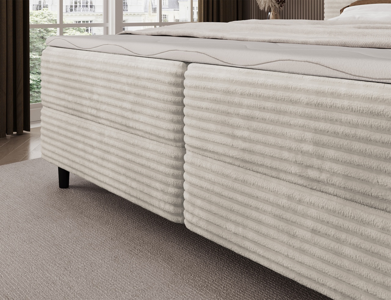 Patul continental Cortiko este o alegere elegantă și confortabilă pentru iubitorii stilului modern. Disponibil în trei variante de dimensiuni: 140x200 cm, 160x200 cm și 180x200 cm. Înălțimea totală a patului este de 102 cm, iar adâncimea de 222 cm, oferind o structură stabilă și echilibrată. Combinația dintre arcurile Bonell și spuma T2540 asigură un suport excelent pentru corp și un confort ridicat în timpul somnului. Modelul Cortiko este echipat cu un compartiment practic pentru depozitarea lenjeriei, care ajută la menținerea ordinii și la utilizarea eficientă a spațiului din dormitor. Picioarele negre din lemn completează designul, adăugând eleganță și lejeritate. Cu un design modern, patul Cortiko se potrivește perfect atât în interioare minimaliste, cât și în amenajări mai expresive, devenind un element stilat și funcțional al oricărui dormitor. Dimensiuni: Lățime: 182 cm Lungime: 222 cm Înălțime: 102 cm Înălțime șezut: 56 cm Suprafață dormit: 160x200 cm Înălțime picioare: 10 cm Recipient depozitare lenjerie de pat: 2x 182x76x15 cm Spătar tapițat: nu Capacitate ridicare: 240 kg Produsul nu este montat, montarea este rapidă și ușoară. Produsul este personalizabil, culoarea și materialul se aleg pe baza paletarelor la cererea clientului. Prețul poate suferi modificări în funcție de grupa de material aleasă.