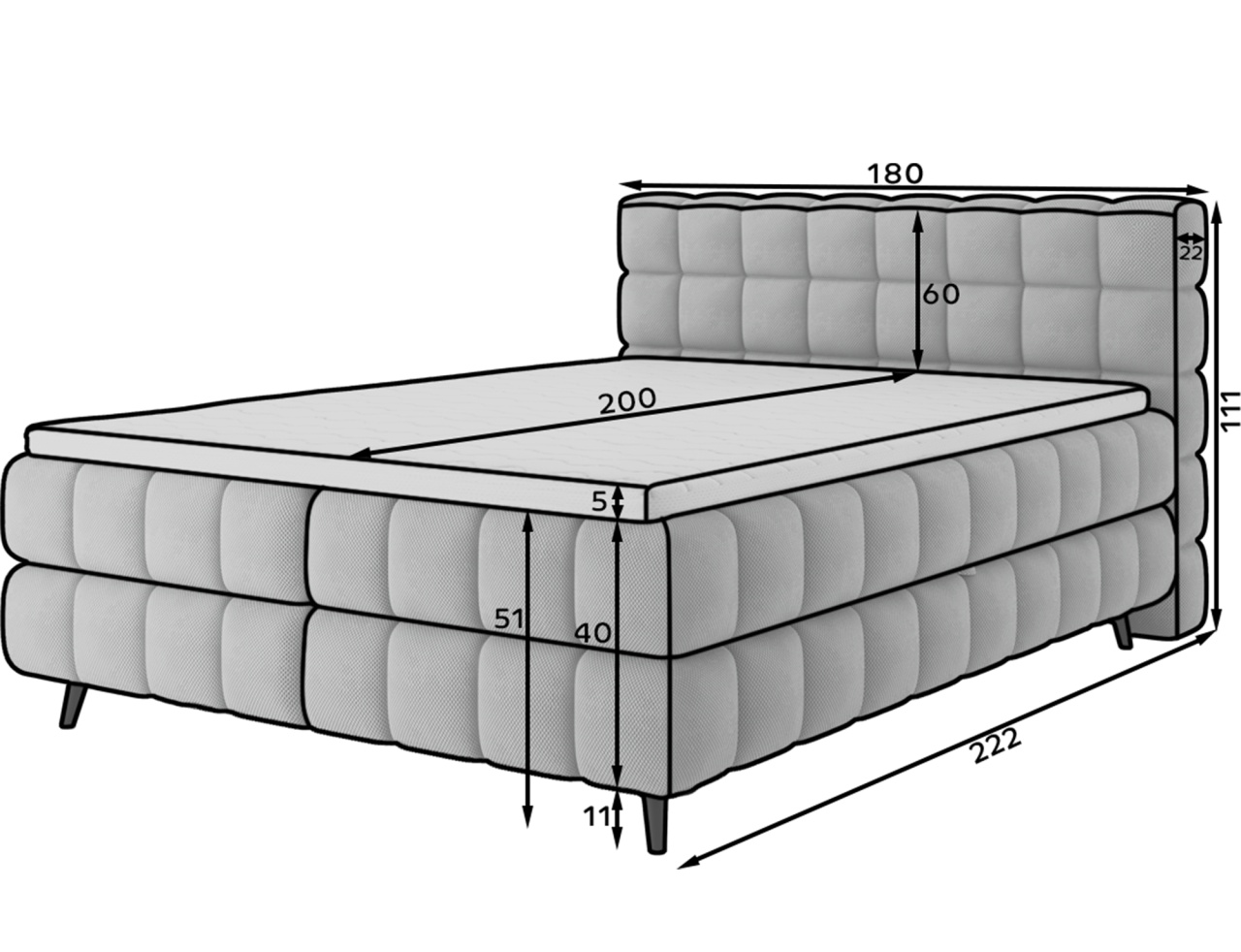 Patul continental Sabeno este o alegere elegantă și funcțională pentru orice dormitor modern. Modelul este disponibil în trei variante de dimensiuni: 140x200 cm, 160x200 cm și 180x200 cm, permițându-vă să ajustați lățimea patului în funcție de nevoile individuale. Confortul în timpul somnului este asigurat de combinația dintre arcurile Bonell și spuma T2540, care oferă susținere adecvată și durabilitate. Patul Sabeno este echipat cu un compartiment practic pentru depozitarea lenjeriei. Picioarele negre din lemn completează designul, adăugând eleganță subtilă și lejeritate. Stilul modern al patului Sabeno îl face să se potrivească perfect atât în interioare minimaliste, cât și în amenajări mai expresive. Datorită funcționalității, materialelor de înaltă calitate și finisajului estetic, patul continental Sabeno este alegerea ideală pentru cei care apreciază confortul, durabilitatea și mobilierul de dormitor stilat. Dimensiuni: Lățime: 202 cm Lungime: 222 cm Înălțime: 102 cm Înălțime șezut: 56 cm Suprafață dormit: 180x200 cm Înălțime picioare: 10 cm Recipient depozitare lenjerie de pat: 2x 182x86x15 cm Spătar tapițat: nu Capacitate ridicare: 260 kg Produsul nu este montat, montarea este rapidă și ușoară. Produsul este personalizabil, culoarea și materialul se aleg pe baza paletarelor la cererea clientului. Prețul poate suferi modificări în funcție de grupa de material aleasă.